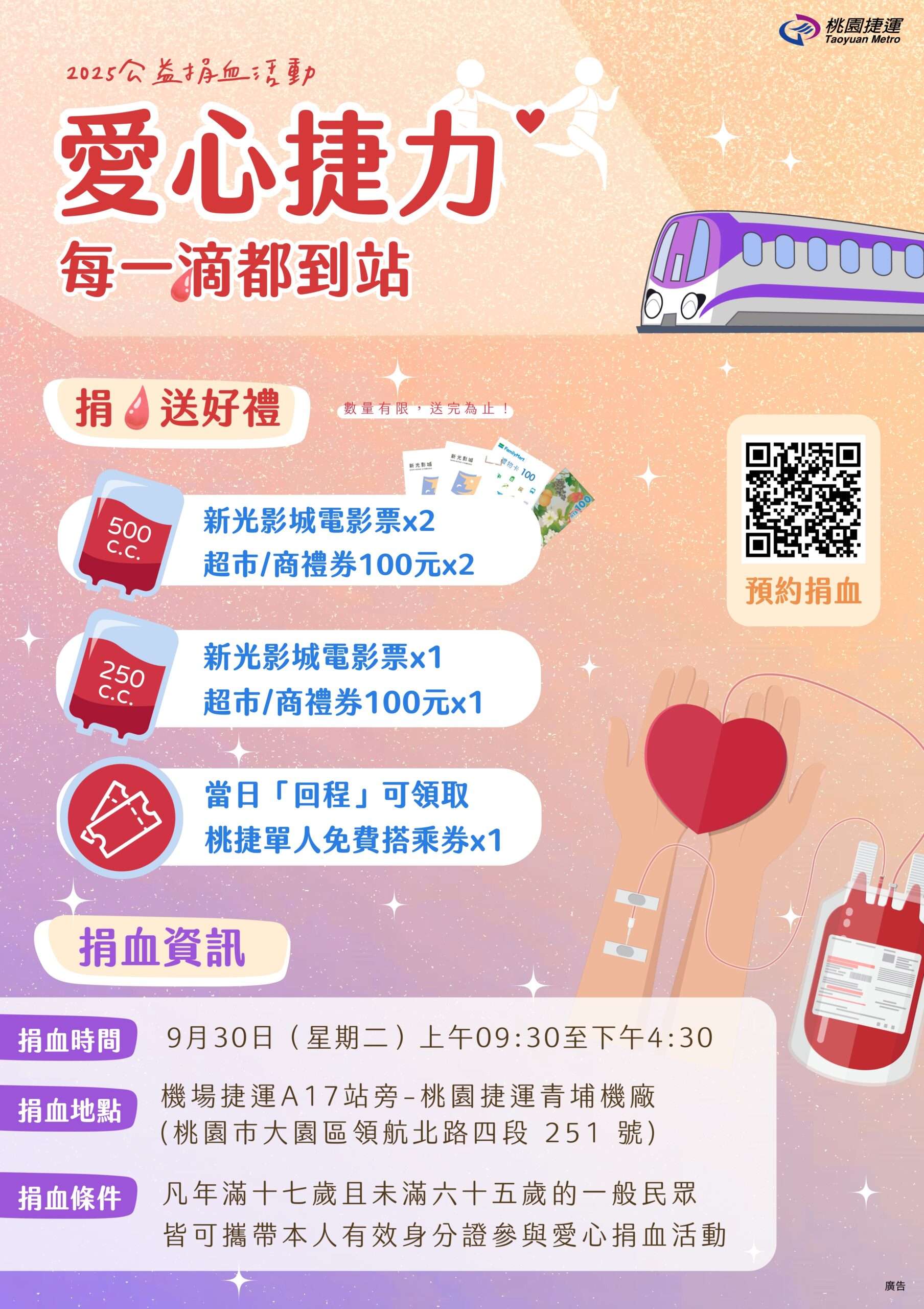 「愛心捷力,每一滴都到站。」桃捷公司將於9月30日上午9時30分至下午4時30分,在機場捷運A17領航站旁青埔機廠門口舉辦公益捐血活動。活動當日準備全台新光影城皆適用的限量電影票300張及連鎖超市(商)禮券,凡捐血250c.c.可獲得電影票及100元禮券各1張;捐血500c.c.則可獲得各2張,數量有限,送完為止,邀請員工與民眾共同挽袖響應。
