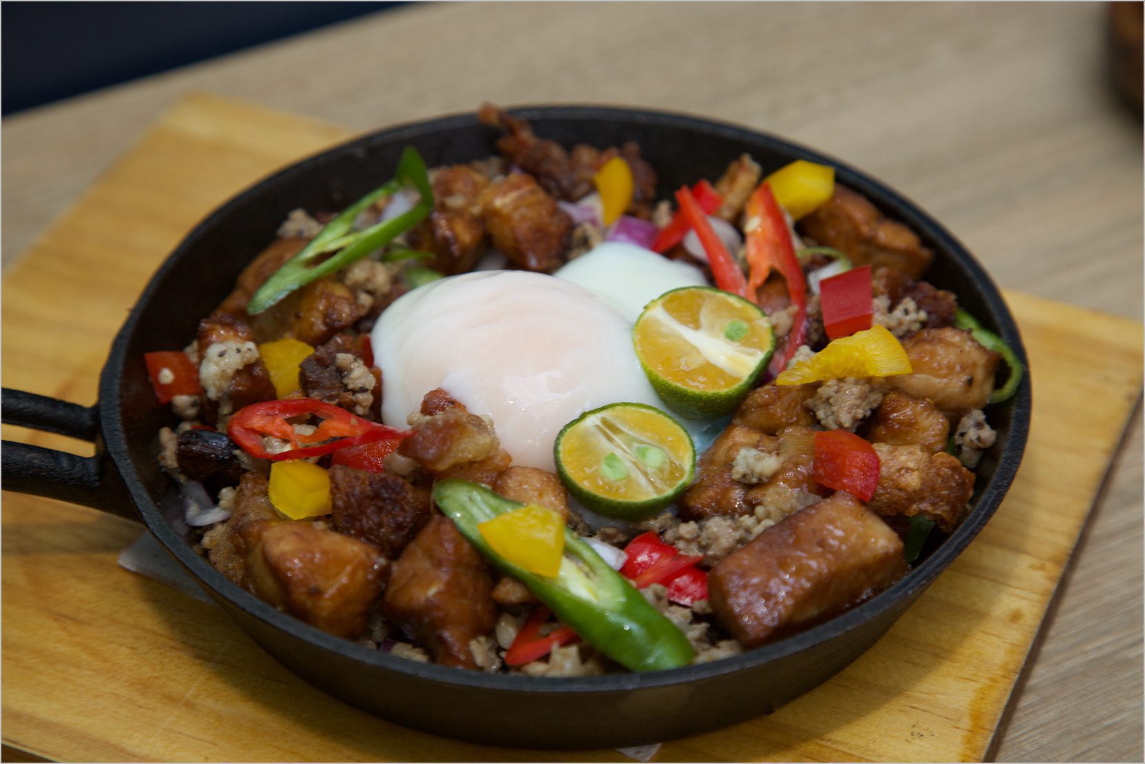 「比科爾式鐵板旗魚 Sisig」端上桌時「滋滋」作響,香氣四溢。