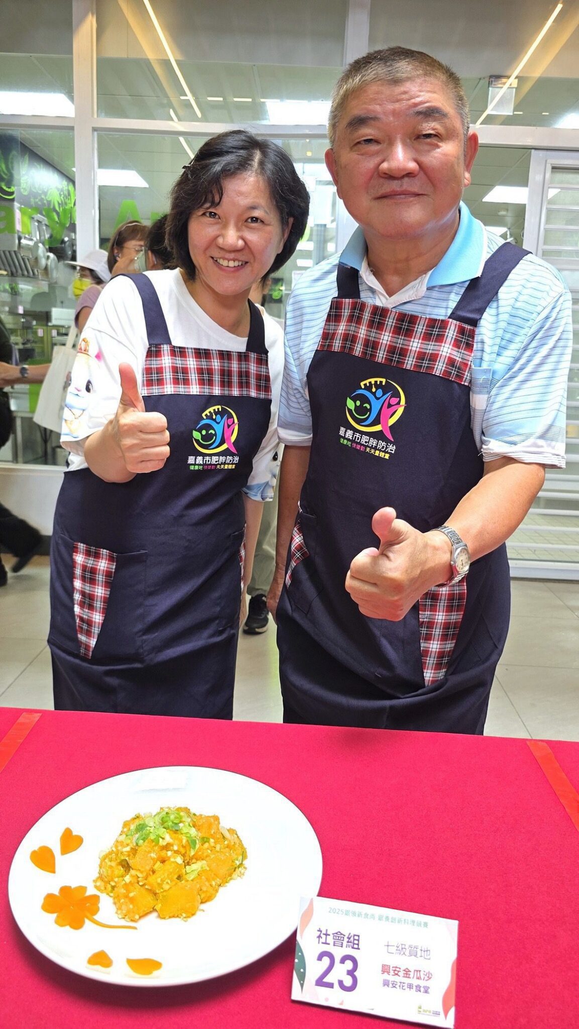 興安花甲食堂陳坤明總幹事及謝雅青志工推出的參賽作品「興安金瓜沙」,獲得評審青睞,也顛覆大家對長輩餐「只能軟爛、清淡」的刻板印象。陳總幹事笑著說,只要發揮一點小巧思,就能讓長輩吃得開心、還能得到大獎!