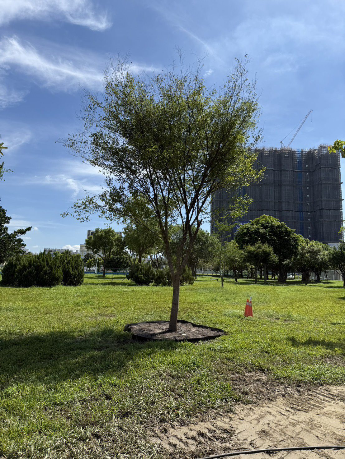 建設局進一步指出,樹木移植的關鍵在於根系發展與支撐穩定,此次導入的「空氣盆」技術,於樹木種植前保留全樹型與大部分頂芽,喬木球根利用空氣盆育苗方式,以空氣切根原理有效促進根系新生,再搭配現場施作地下隱形支架系統,以土球自身重量結合下方五角形支架形成穩固結構,能有效抵抗強風(13級風)並降低因傳統支架設置導致民眾絆倒之風險,同時樹穴以拌和土進行土壤改良,提升樹木基盤養分、排水與透氣性,不僅可提升移植存活率,也同步優化視覺景觀與公共安全。市民可在即將來臨的「台中市民野餐日」與家人朋友一同於樹下閱讀、野餐,享受都市綠肺中舒適休閒生活。