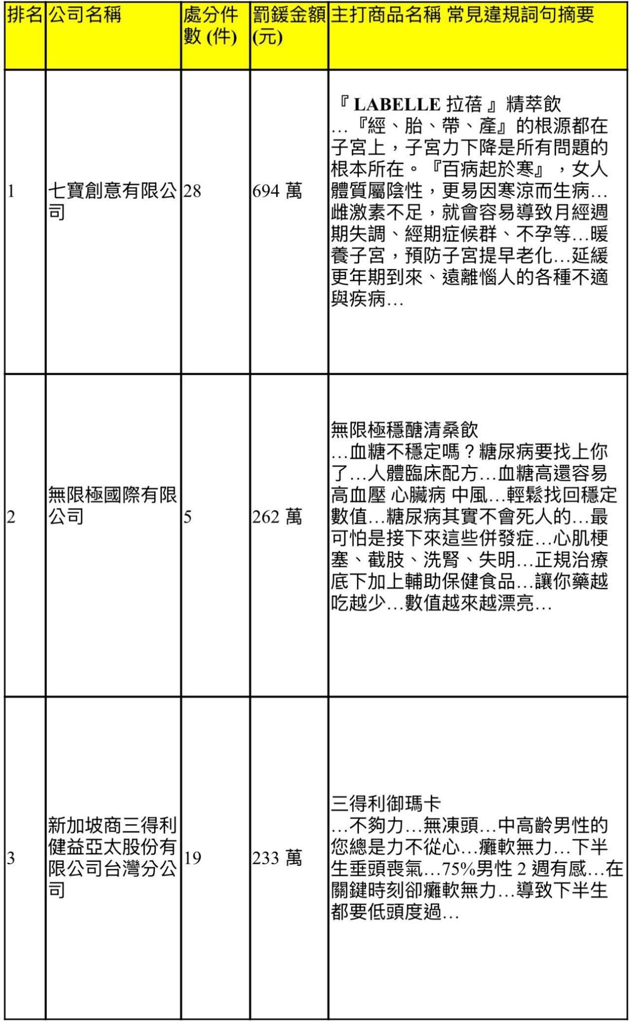 北市衛生局統計罰鍰累計前3名違規產品廣告,罰鍰累計第1名為「七寶創意有限公司」,違規廣告罰鍰達694萬元,該公司「拉蓓『暖宮精萃飲』」食品廣告詞句涉及醫療效能。罰鍰累計第2名為「無限極國際有限公司」,違規廣告罰鍰達262萬元,其「無限極穩醣清桑飲」食品廣告詞句涉及醫療效能。罰鍰累計第3名為「新加坡商三得利健益亞太股份有限公司台灣分公司」,違規廣告罰鍰233萬元,該公司之「三得利御瑪卡」產品廣告涉及誇大不實,衛生局針對以上違規廣告已依法進行裁罰。
