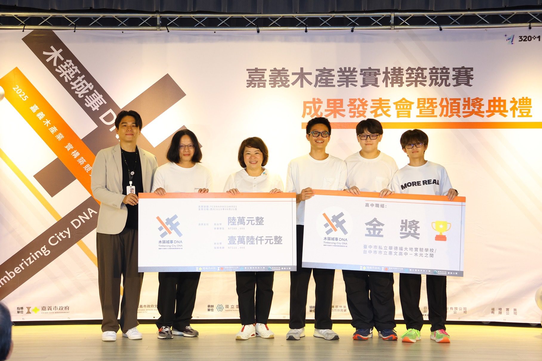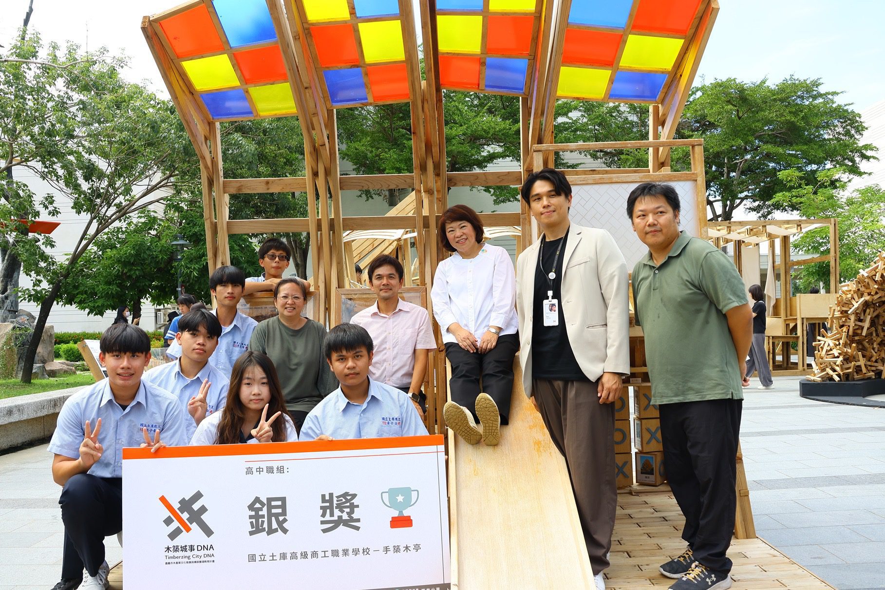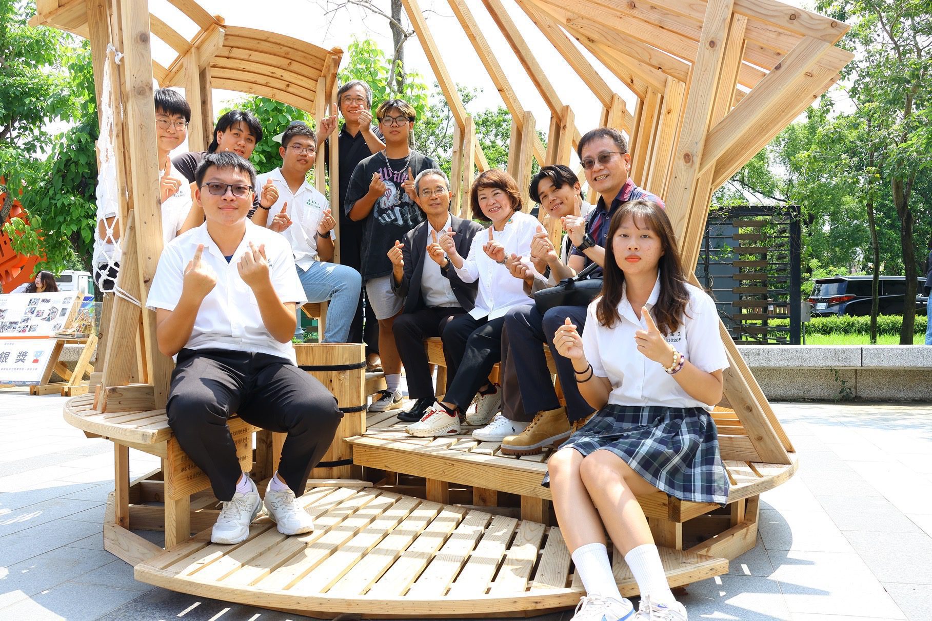 今年大專組金獎由實踐大學作品《Pavilion of Stacking》奪得。作品靈感取自河狸築壩行為,以木材堆疊方式重現「河狸池」自然濕地的和諧美景,展現生態與人文的高度融合。高中職組金獎則由臺中市私立華德福大地實驗教育學校與台中市市立惠文高中聯合創作的《木光之間》脫穎而出,作品未使用任何螺絲或鐵釘,改以農用布料固定木構,創新詮釋傳統工藝,團隊成員雖非設計科班出身,卻展現驚人的創造力與執行力。