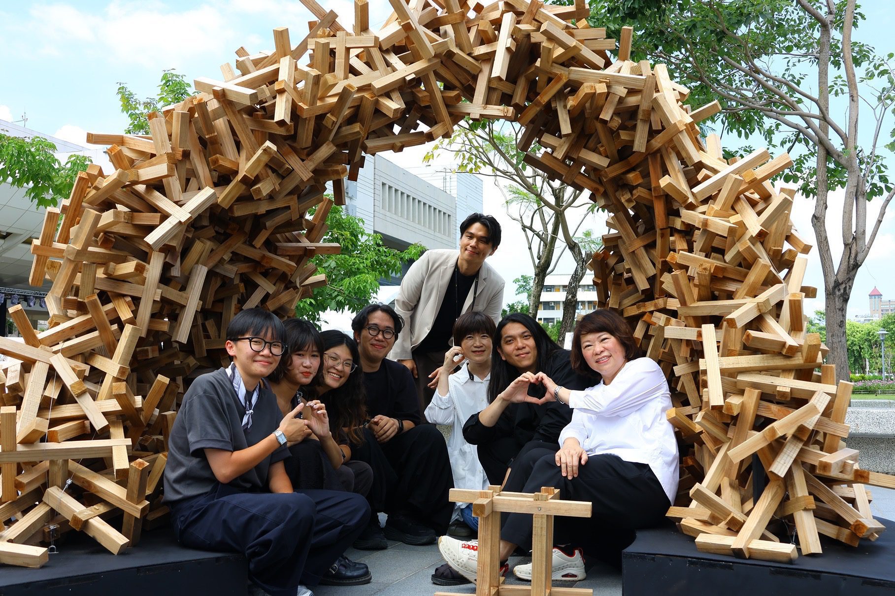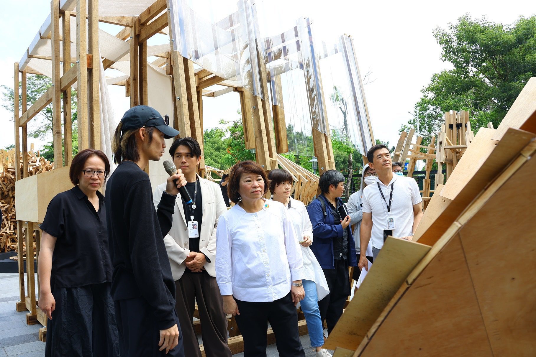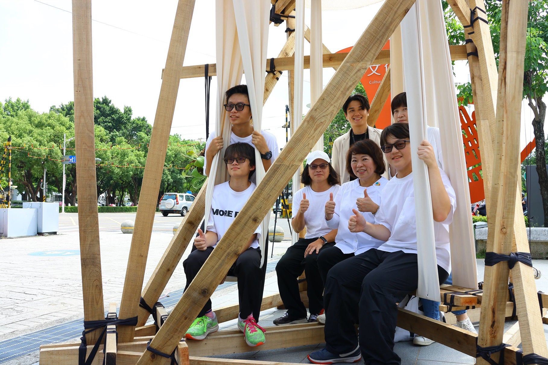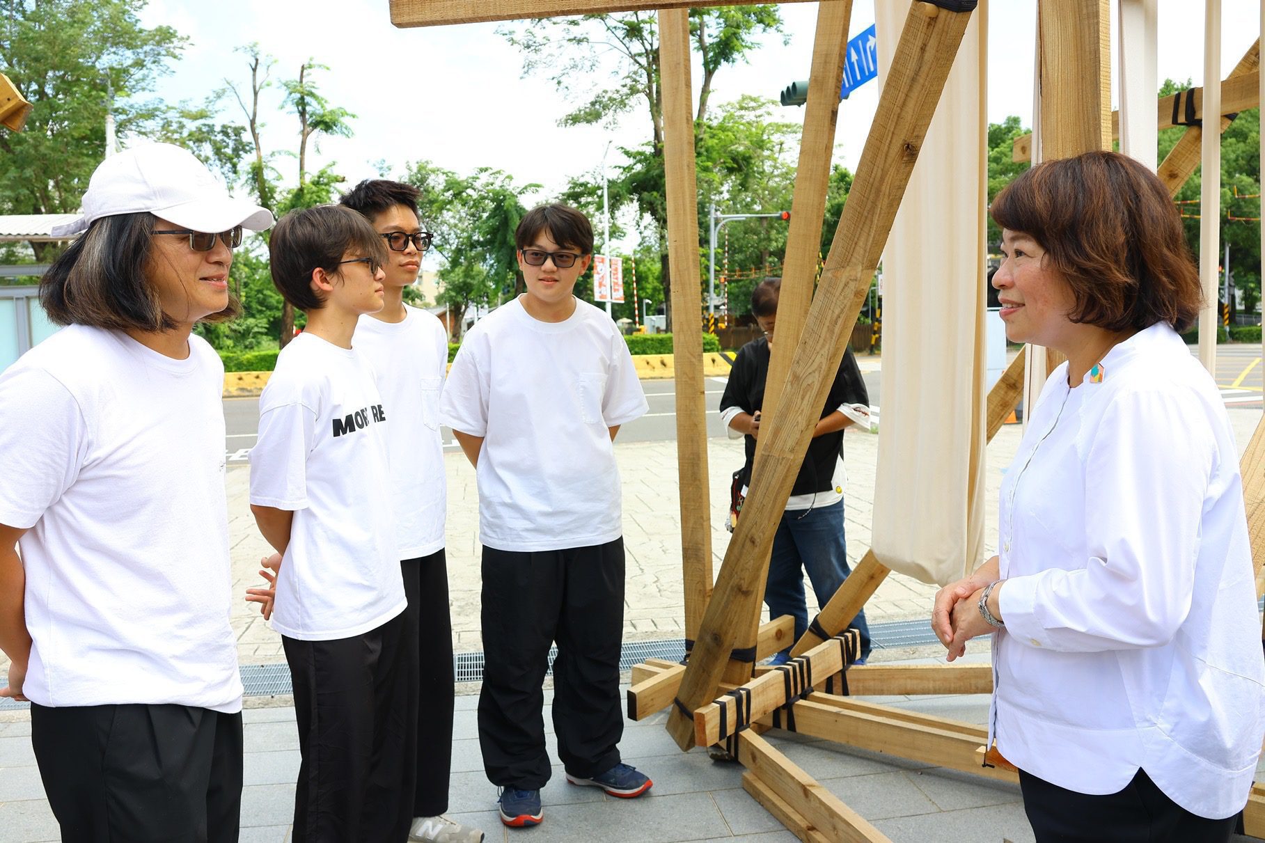黃敏惠在學生進行實地搭建時,即曾特地前往為學生送上鼓勵,今日看到各有精采的作品呈現眼前,感動表示,雖然從設計、模型製作到實地搭建,每一步都充滿挑戰,學生實地搭建的3天2夜中更經歷風雨及炎熱氣溫的挑戰,但參賽的學生們極大的熱情與努力,難能可貴;同時,感謝日本業者以先進防腐技術,與在地製材所合作,讓這些作品得以落地實現。