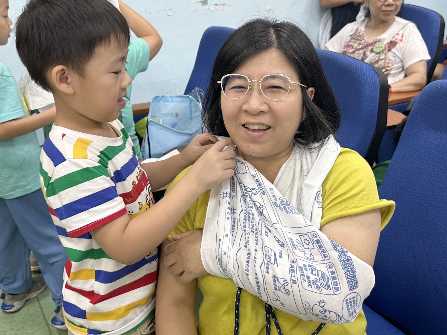 今年特別研發《防災避難小祕笈》教材,並首創設計專屬於臺北市的多功能「防災巾」,結合入班示範教學推廣。