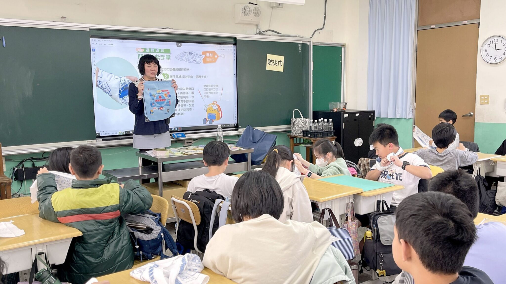 臺北市政府教育局積極推動防災教育,本市各級學校已將防災教育納入年度計畫,今年特別研發《防災避難小祕笈》教材,並首創設計專屬於臺北市的多功能「防災巾」,結合入班示範教學推廣,讓學生在課堂中透過閱讀、體驗與操作,將防災知識化為生活技能,全面提升校園及家庭的防災韌性。