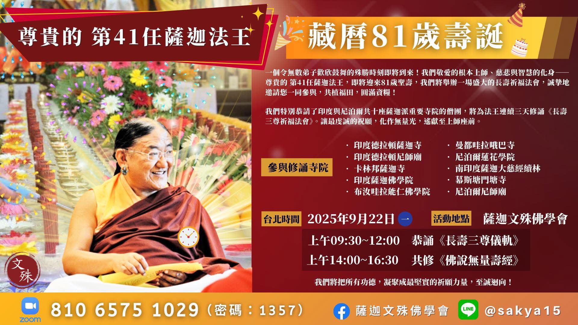 第41任薩迦法王 Kyabgon Gongma Trichen Rinpoche(Sakya Trichen),出自西藏薩迦傳承之昆氏(Khön)家族,為薩迦法脈歷代法座持有者之一。以清晰次第、溫厚慈悲的教學風格弘化世界各地;移交法座後(移交予第42任法王-大寶金剛仁波切),仍持續應請開示、主持法會、護持教育與慈善事業。