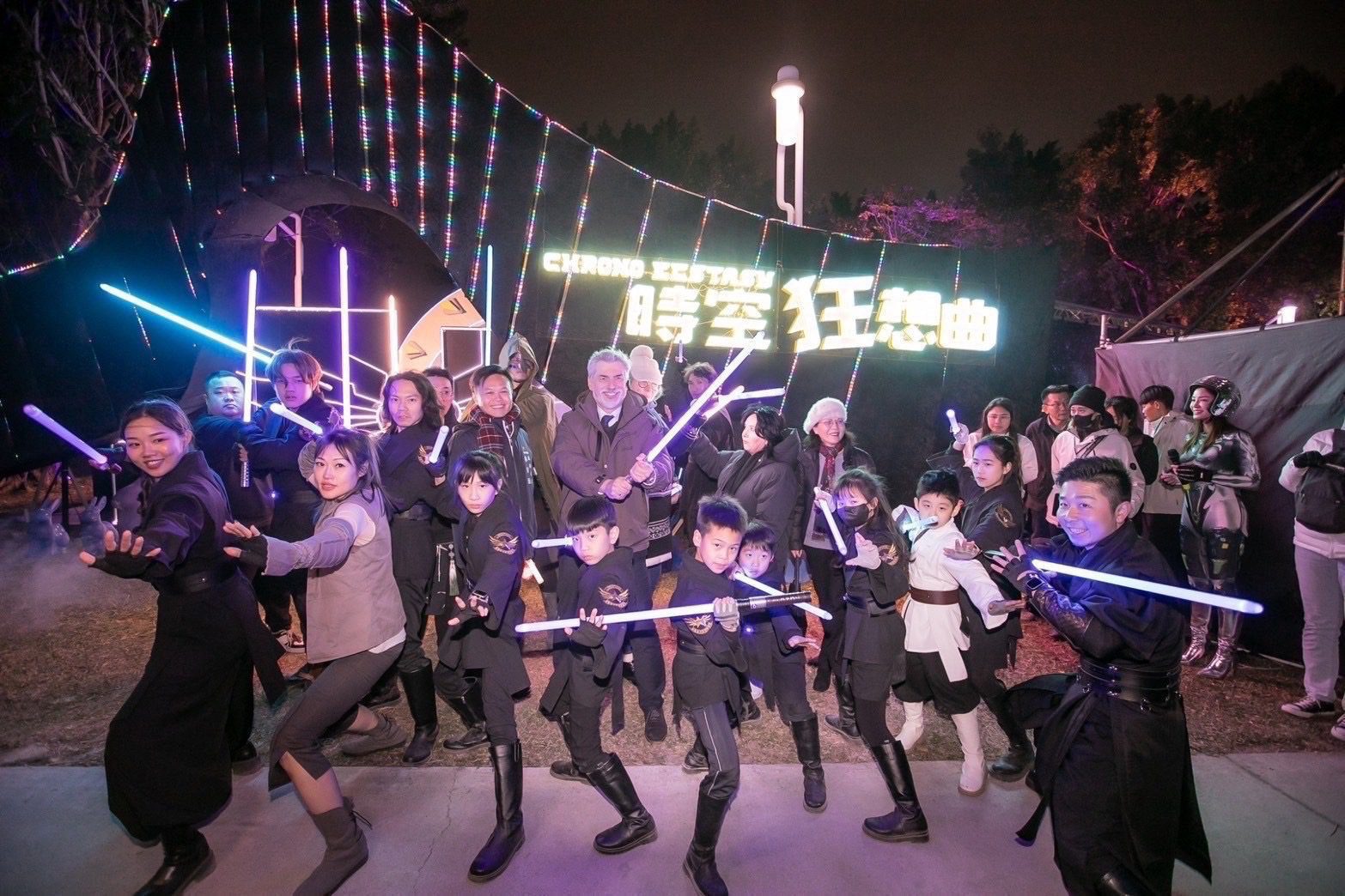 建設局表示,波蘭台北辦事處高處長在觀賞主燈秀後,隨即參觀「時空狂想曲」燈區,由林副秘書長陪同進入平行宇宙,並與熱情的光劍武士合影。他讚嘆燈區設計充滿創意與未來感,讓人眼睛一亮。隨後,他穿越光廊、銀河之樹,來到星際酒吧,欣賞假日限定的鏡面人舞蹈表演,在霓虹燈光與音樂節奏中搖擺,與現場觀眾一同沉浸於宇宙狂歡派對,感受科技與藝術交織的震撼魅力。