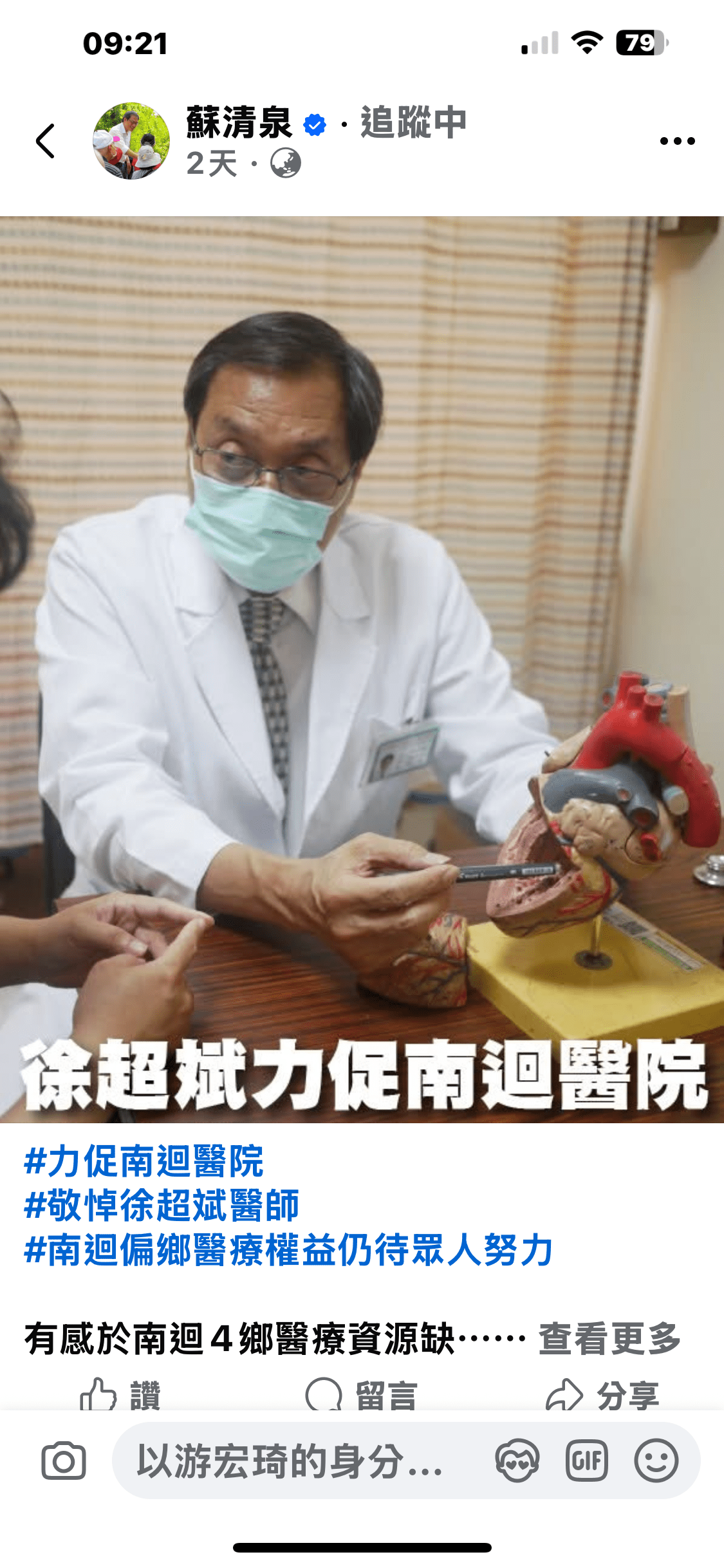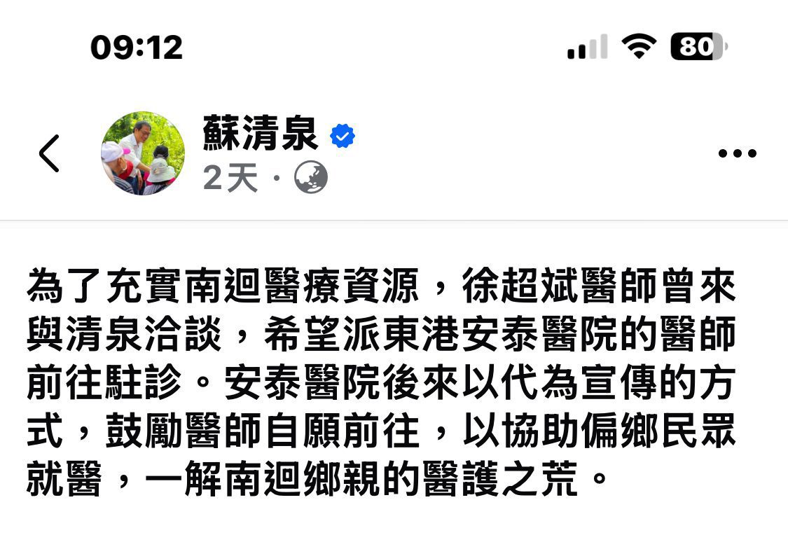 他在貼文中透露,徐超斌曾與他討論,希望安泰醫院能派醫師前往南迴駐診。但蘇清泉的做法僅止於「安泰醫院後來以代為宣傳的方式,鼓勵醫師自願前往」,並無具體政策或資源挹注。