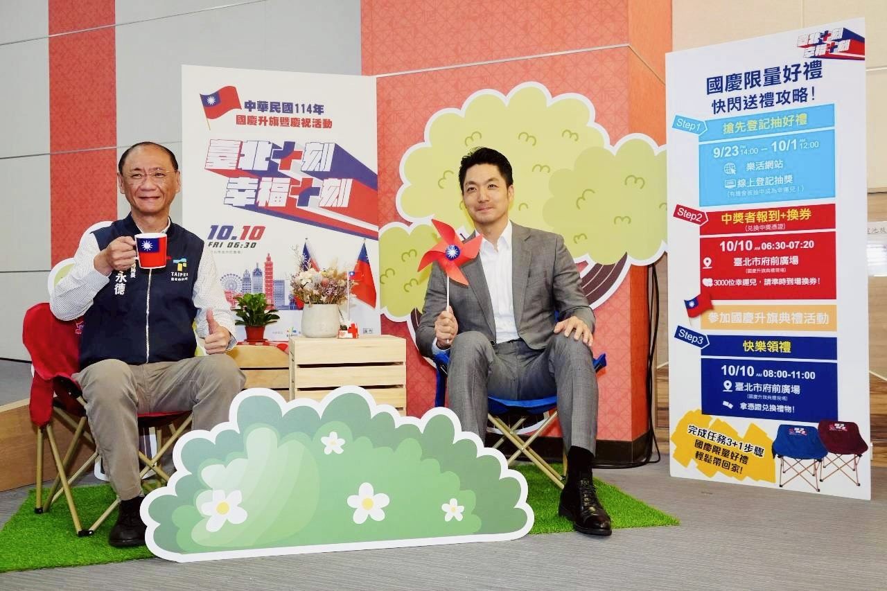 今年活動規劃三大亮點:第一,臺北市吉祥物「熊讚」將換上特別訂製的國慶服裝驚喜亮相;第二,透過線上登記抽出的3,000位幸運市民,可獲得兼具露營、野餐與實用的限量「國慶椅」;第三,持「鮮奶週報」數位卡的小朋友可以免費領取一瓶鮮奶,現場並設有20個特色攤位及5個親子DIY體驗攤位,營造豐富多元的國慶嘉年華氛圍。蔣萬安誠摯邀請市民於10月10日眷齊聚市府廣場,共度國慶佳節。