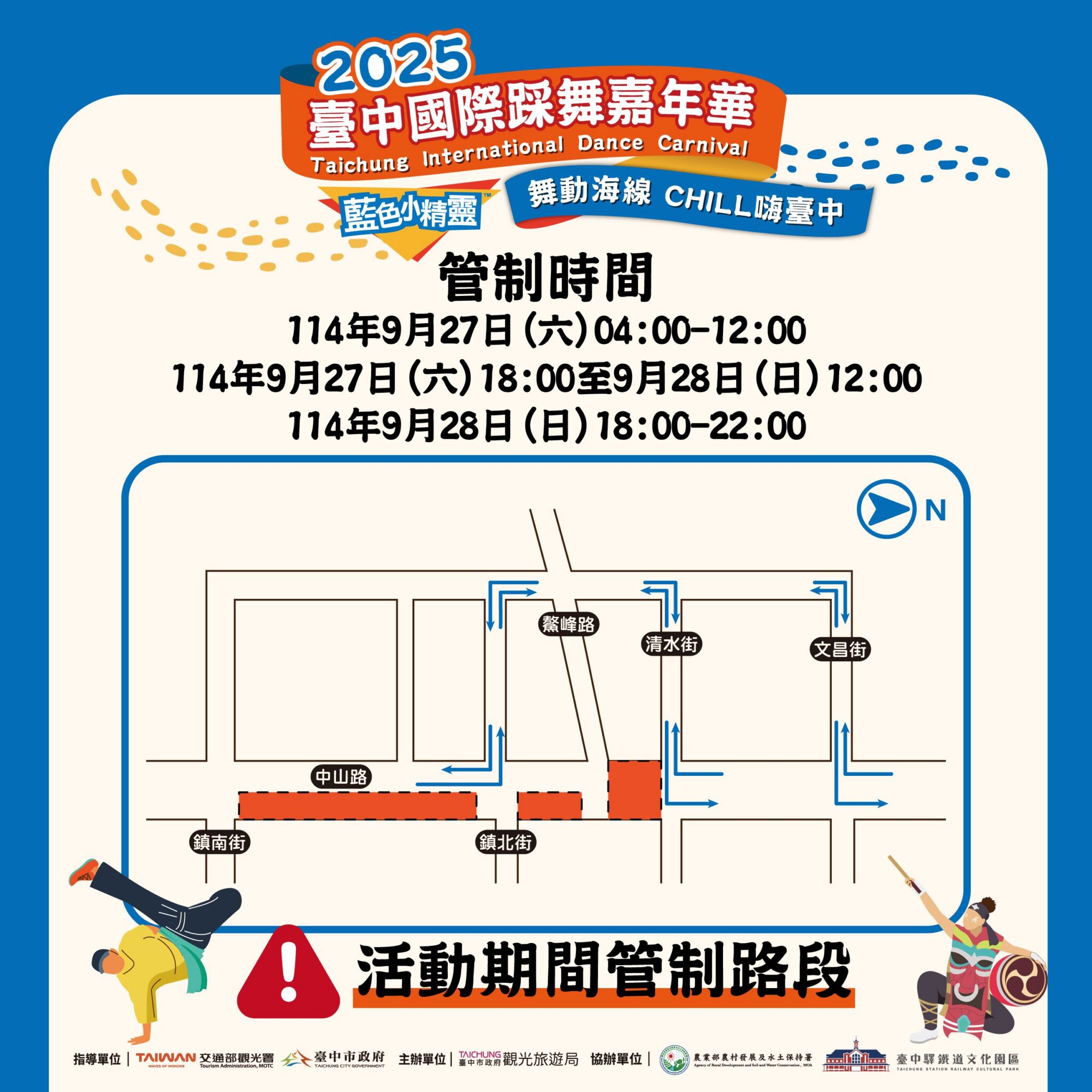 2025台中國際踩舞嘉年華將於9月27日至28日在清水盛大舉行,市府將自9月24日起於紫雲巖前搭設晚會舞台、9月27日清晨4時起於中山路與鰲峰路口搭設觀禮台並進行交通管制,至9月28日晚間10時恢復通行,將影響中山路及北寧街車輛行駛與路邊停車,已於活動道路周邊設置改道及交通管制牌面提醒用路人。