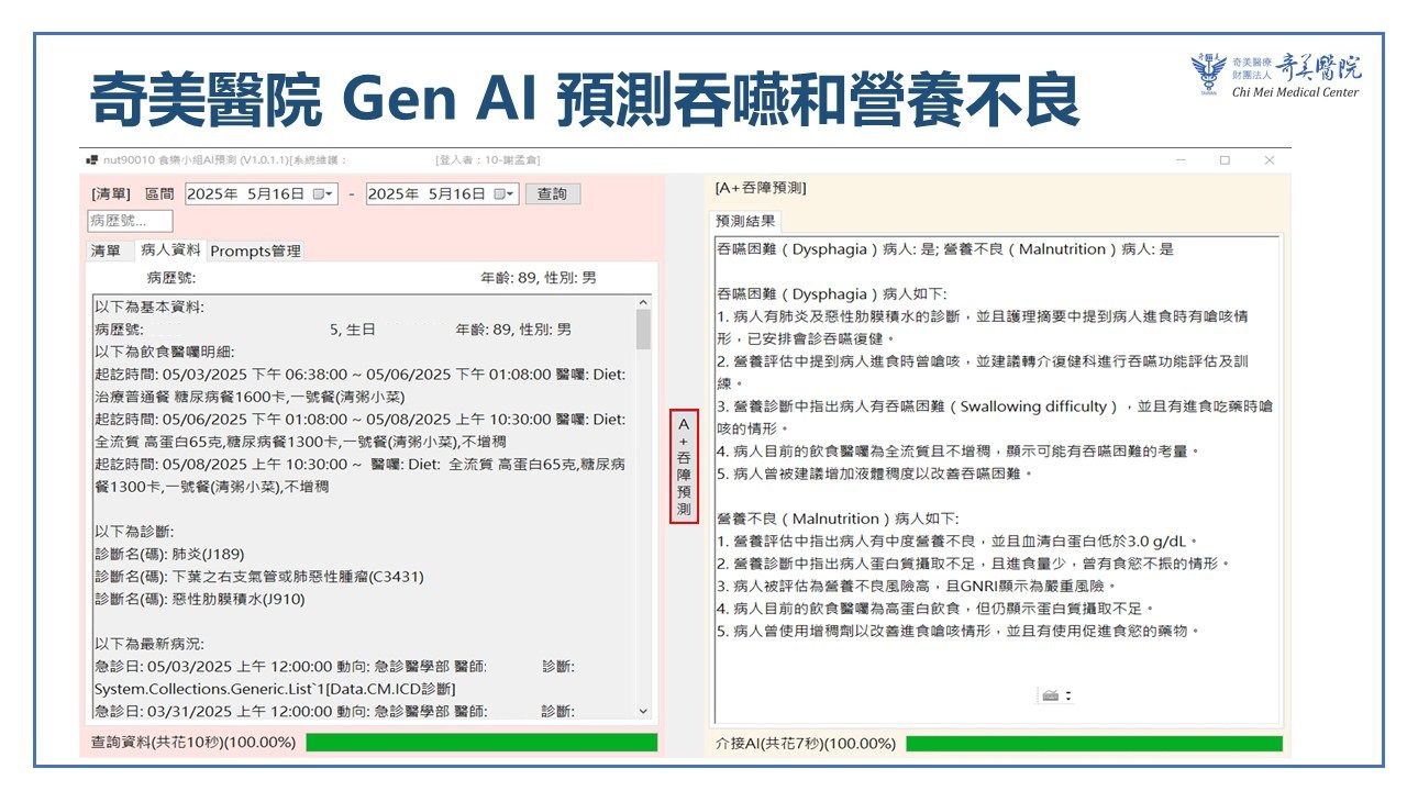 根據臺灣衛生福利部統計,每年約3萬名中風新個案,其中至少三分之一需要專業吞嚥照護,奇美醫院「食樂支援平台」創新照護模式,大幅縮短評估時間。謝孟倉說,奇美醫院2023年成立「食樂支援小組」,團隊運作整合各領域專家,並結合傳統吞嚥篩檢、吞嚥攝影、纖維內視鏡檢查、吞嚥肌群超音波及肌電圖等裝置,運用AI數據分析與生成式AI建議系統,評估中風病人吞嚥風險,能在短短15到20秒內,詳細完成病人一週的個人化飲食菜單與運動訓練清單,取代傳統醫療人員須耗時40分鐘以上的評估、衛教與計畫撰寫。