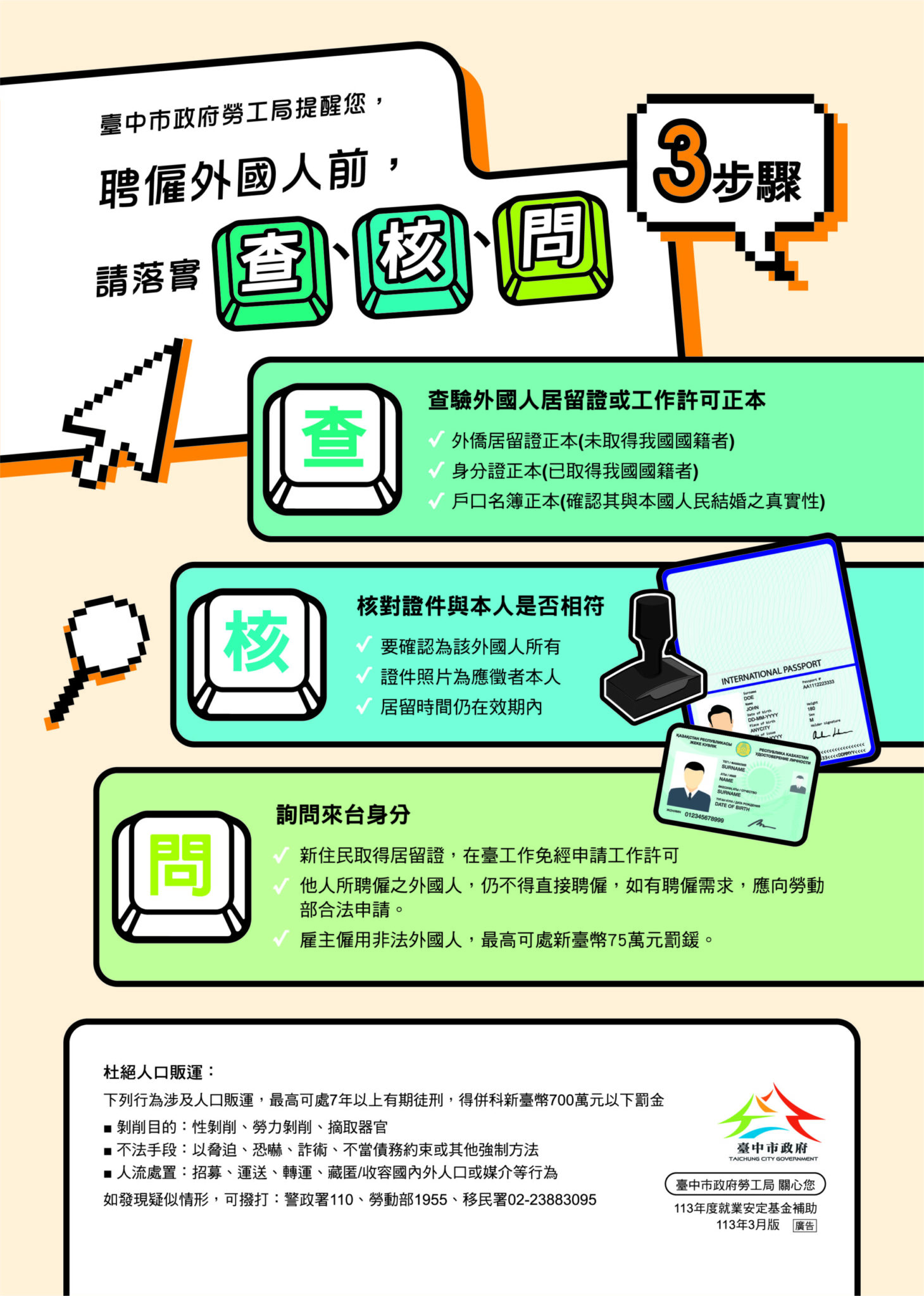 隨著春節假期結束,勞動市場迎來年後轉職與招工熱潮,部分產業的雇主可能因人手短缺而急於補足人力;台中市政府勞工局提醒,雇主如聘僱外國人應遵守相關規範,切勿僱用或容留身分不明的外國人及他人聘僱的外國人從事工作,以免違法受罰。