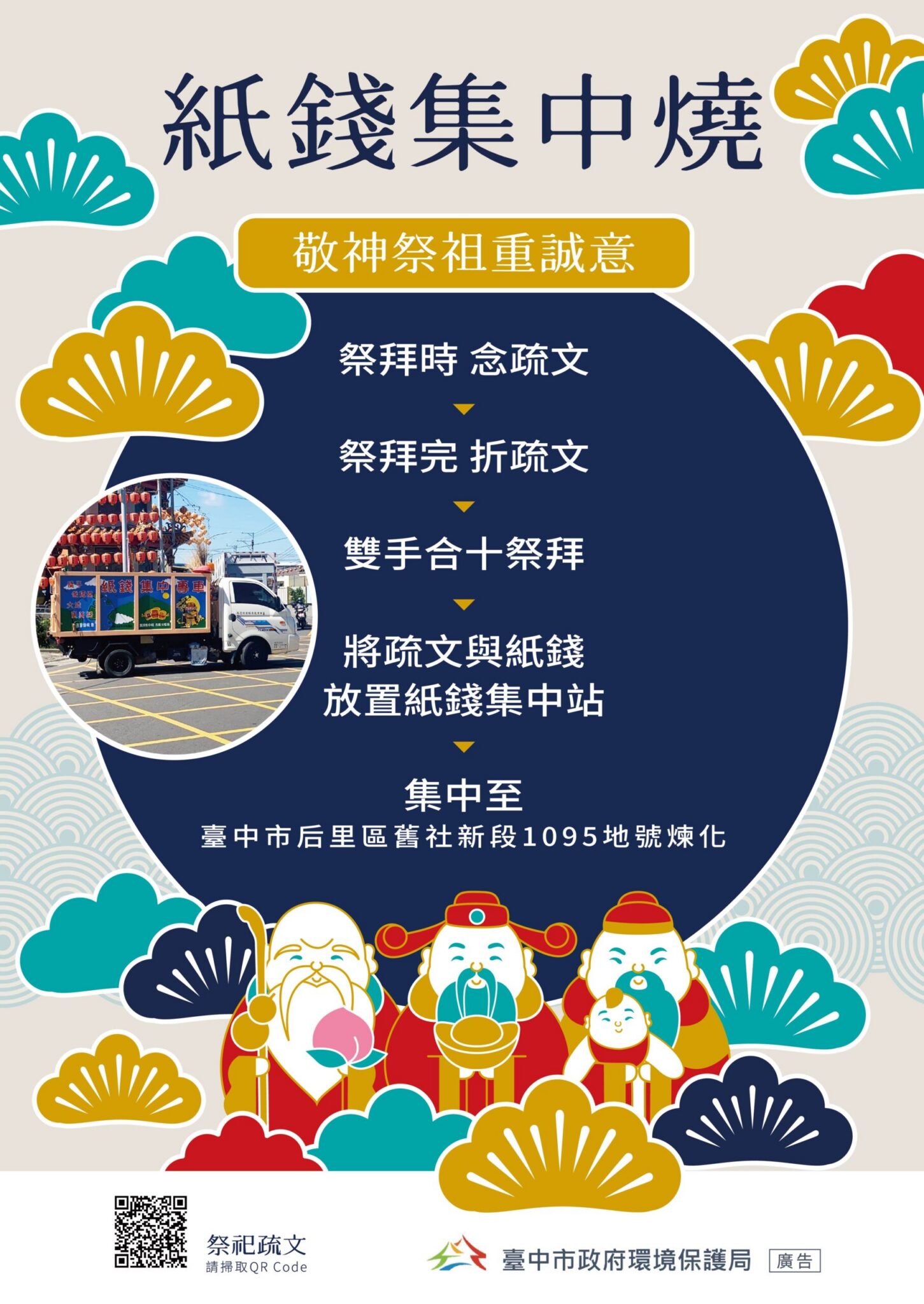 環保局表示,環保祭祀措施常被認為與傳統民俗有所牴觸,隨新時代來臨及生活環境等不斷轉變,大部分宮廟已設置紙錢集中專區,鼓勵民眾祭拜紙錢時以疏文方式向神明禱念祈福後送至廟方紙錢集中專區,統一煉化處理。目前台中市設有紙錢集中專區的宮廟包括大甲鎮瀾宮、清水紫雲巖、南屯萬和宮、太平福成宮、東區樂成宮及中區萬春宮等642處宮廟。