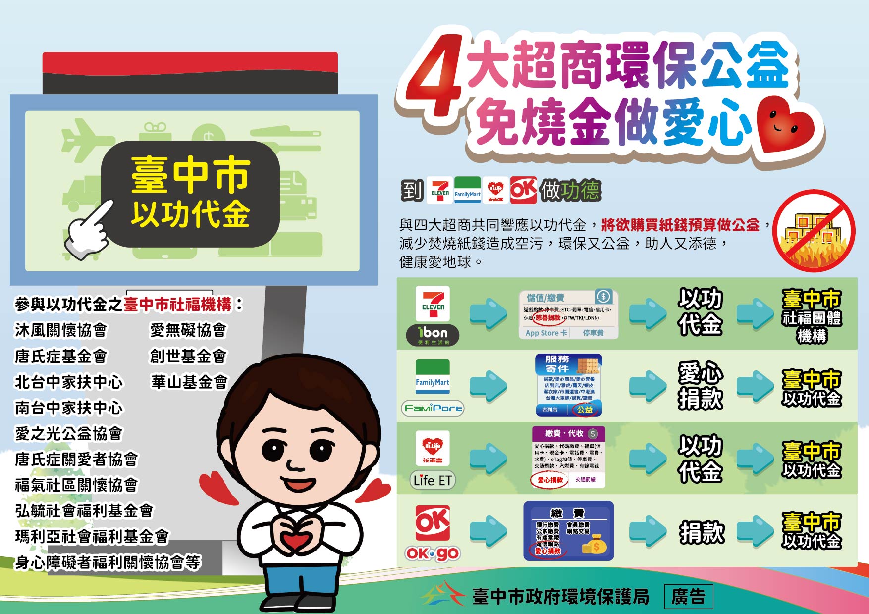 環保局表示,感謝市民朋友與宮廟認同環保祭祀措施,降低區域性空氣污染的發生,接下來將是清明祭祖的重要節慶,環保局清潔隊紙錢集中便民服務全年不打烊,仍期待市民朋友清明祭祖時,持續配合紙錢源頭減量集中措施,或是將購買紙錢的費用透過四大超商事務機,選擇「台中以功代金」活動捐助13家社福團體,以「捐款做功德」替代舊有的「實體紙錢焚燒」,落實環保、兼做公益,祈福庇佑不減,同時維護鄰近空氣品質及民眾健康。