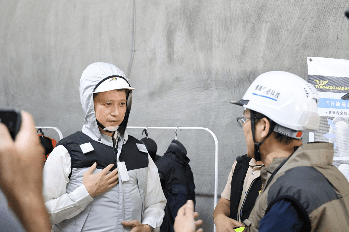 今年活動的另一大亮點,是在觀摩活動規劃展示多項工地防護設施專區,包括夜間LED標示纜線、多款水霧風扇,以及風扇衣、具備吸/排切換風扇的安全帽等降溫神器,特別吸引大家現場穿戴體驗。另外新型墜落防護設備救援三角架,適用於局限空間作業,是提升勞工安全的利器。現場並有防護面具,有效降低焊接強光,以及工地感測監測系統展示,吸引業界代表到場觀摩交流。