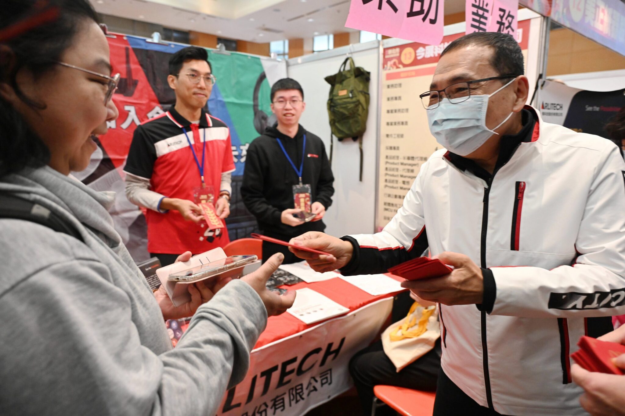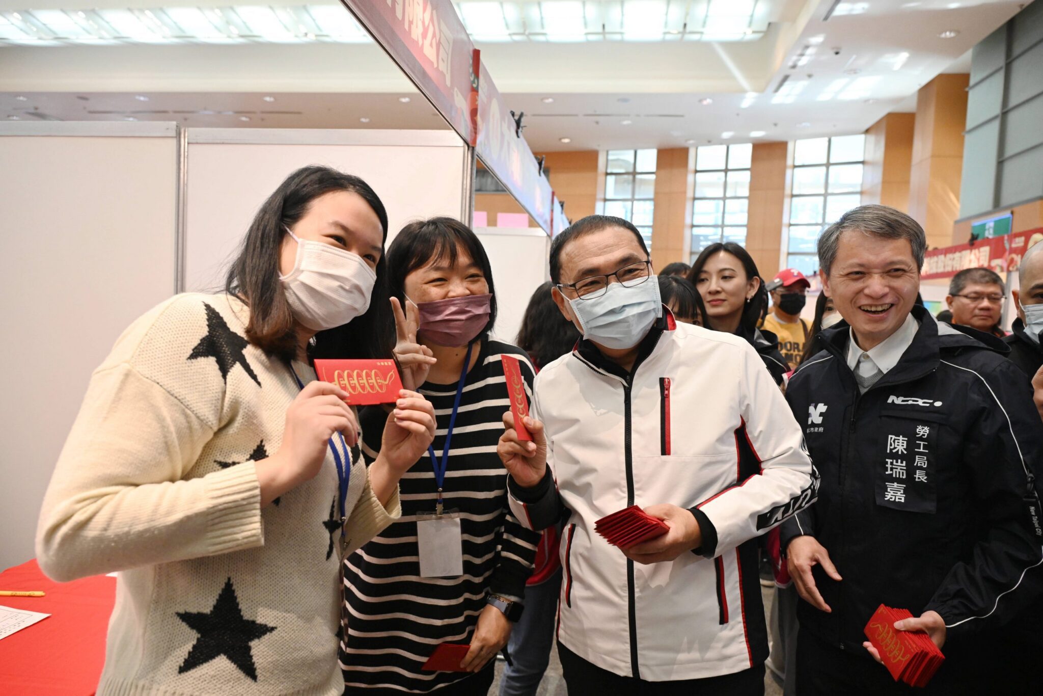 侯友宜也到活動現場為民眾加油打氣,祝福每個拿到福袋的市民萬事都好、攏有賺錢。勞工局長陳瑞嘉表示,這場活動是春節後第一場就業博覽會,不少民眾都前來物色適合的職缺,想轉職的也不在少數,其中旅宿餐飲業仍受到缺工影響,為本次最大宗求才產業職缺占4成8,其次為科技製造業占比2成,希望大家能把握機會;而新北擁有全國最綿密的就業服務網,未來更預計增設林口站,服務更多市民朋友,提供更全面的就業諮詢服務。