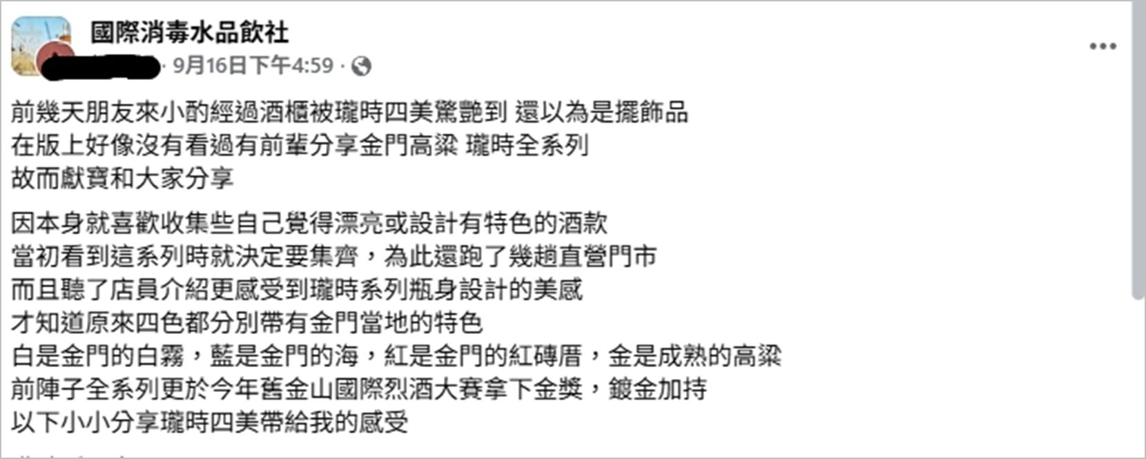 原 PO 表示,自己平時就熱衷收藏富有特色美感、設計感強烈的酒款,當初見到「瓏時四美系列」直接被美暈決定全套集齊,為此還跑了好幾趟直營門市。由四種顏色設計的「瓏時四美系列」,運用白色象徵金門的白霧、藍色象徵金門的海、紅色則是來自紅磚古厝,金色代表熟成的高粱穗,原PO分享在理解背後設計元素之後更是深深著迷!讓不少網友留言表示,「這系列真的很漂亮」、「風格有別以往 好特別」、「竟然有得獎! 台灣之光」、「感謝分享 好像可以買」。