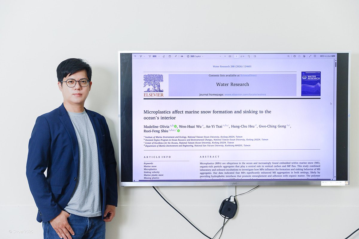 許瑞峯於9月最新研究甫獲得領域排名第一的頂尖期刊《水研究》(Water Research, IF=12.4, 1/97=Top 1% in Water Resources)刊登,成功地揭示不同類型與型態微型塑膠的嵌入會增加有機物的纏繞和黏附,提高海洋塑膠雪花進入食物網的的機率,成功鏈結塑膠污染傳輸與有機碳封存的關係,同時也為全球海洋中「消失的塑膠」的去處提供一個可能的傳輸機制。