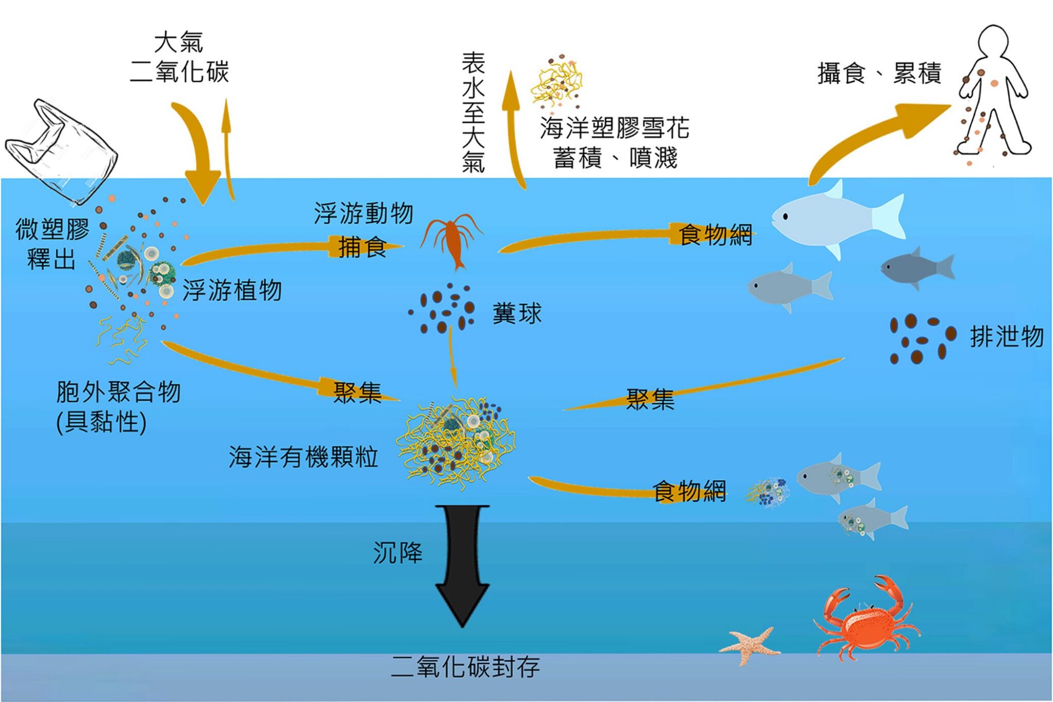 你知道嗎?塑膠垃圾進入海洋後不只漂浮在海面上,還會分解成肉眼難以看見的微型塑膠(microplastics),甚至奈米塑膠。許瑞峯的研究發現,這些微型塑膠會和海水中的藻類、膠體聚集,形成類似雪花的團塊。由於比表面積小,海洋塑膠雪花也容易吸附污染物質,進入食物鏈後容易透過生物累積或放大效應,影響生物體生理功能,干擾海洋生態;或甚至會在海浪拍打的過程噴發至大氣中。