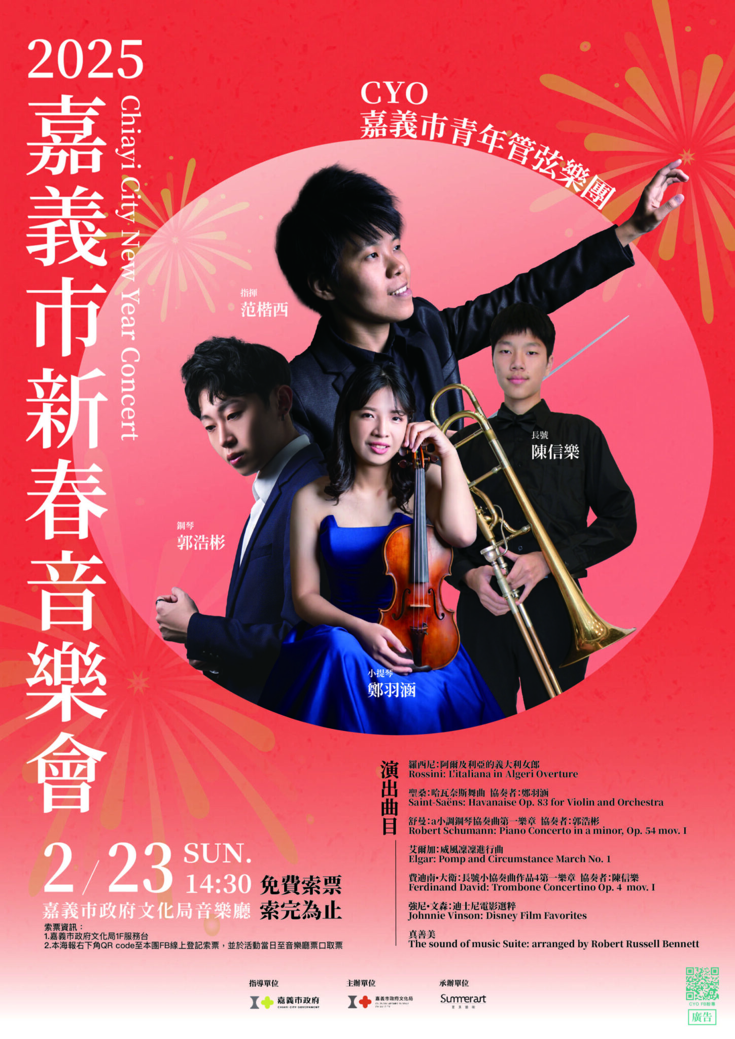 在全國頗具盛名的嘉義市新春音樂會,欣逢「嘉義市建城321年」,將於2月23日登場,由代表嘉義市的聲音—嘉義市青年管弦樂團領銜演出,在知名指揮家范楷西教授的指揮下,奏響歌劇大師羅西尼序曲、英國作家艾爾加進行曲、三首協奏曲及最受歡迎的《迪士尼》及《真善美》電影配樂,在新的一年裡為樂友們送上滿滿的祝福。