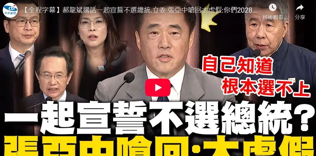 1號張亞中首先對花蓮鄉親表示同心同在。而台灣頭上也有堰塞湖,2028年以前賴清德沒有能力解決,國民黨要不要解決?維持現狀、一中各表、尊重憲法,這藥方都是糖水,喝了自己爽,騙騙老百姓,台灣頭上也有堰塞湖越積越多。