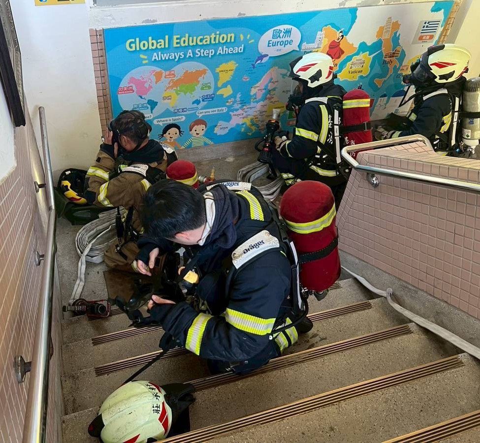 演練過程中,現場指揮官派遣不同分隊進行鐵捲門與教室門的破壞作業,展開滅火攻擊。各分隊人員彼此協調合作,順利完成火場搜索與滅火搶救,共同完成本次演練。