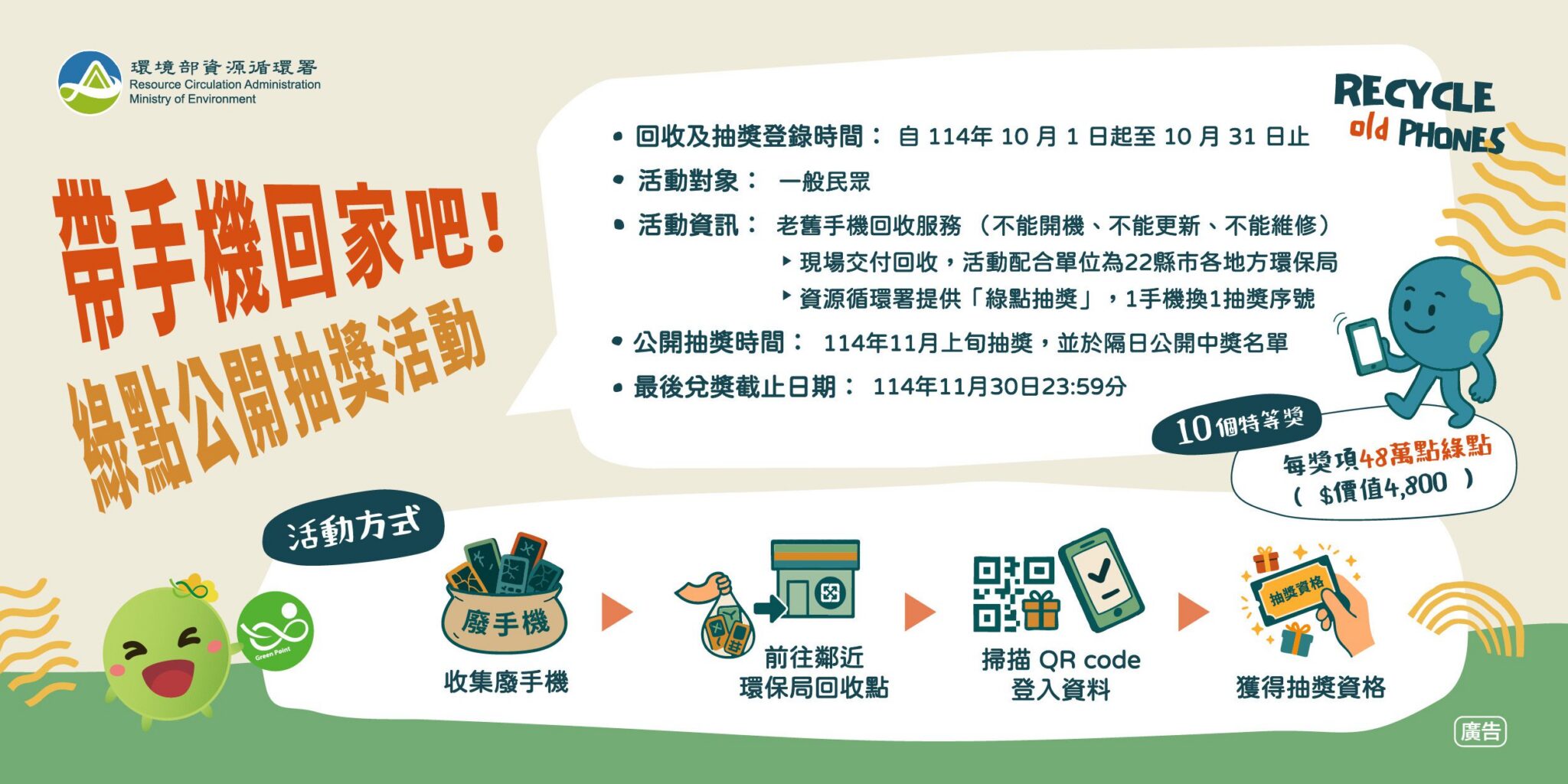 每年10月為環境部資源循環署訂定的手機回收月,為鼓勵民眾將家中老舊或損壞的手機妥善回收再利用,114年資源循環署特別與各縣市環保局合作,辦理回收手機抽綠點活動。民眾把廢手機拿至環保局指定回收點,現場掃描QR code並登錄資料,每回收一支手機,即可獲得一組資源循環署抽獎序號,就有機會抽中資源循環署提供的綠點大獎,共有10個獎項名額,每獎項為48萬點綠點(價值4,800元),將於今(114)年11月上旬抽獎,並公開中獎名單,邀請市民朋友踴躍參加回收手機活動!