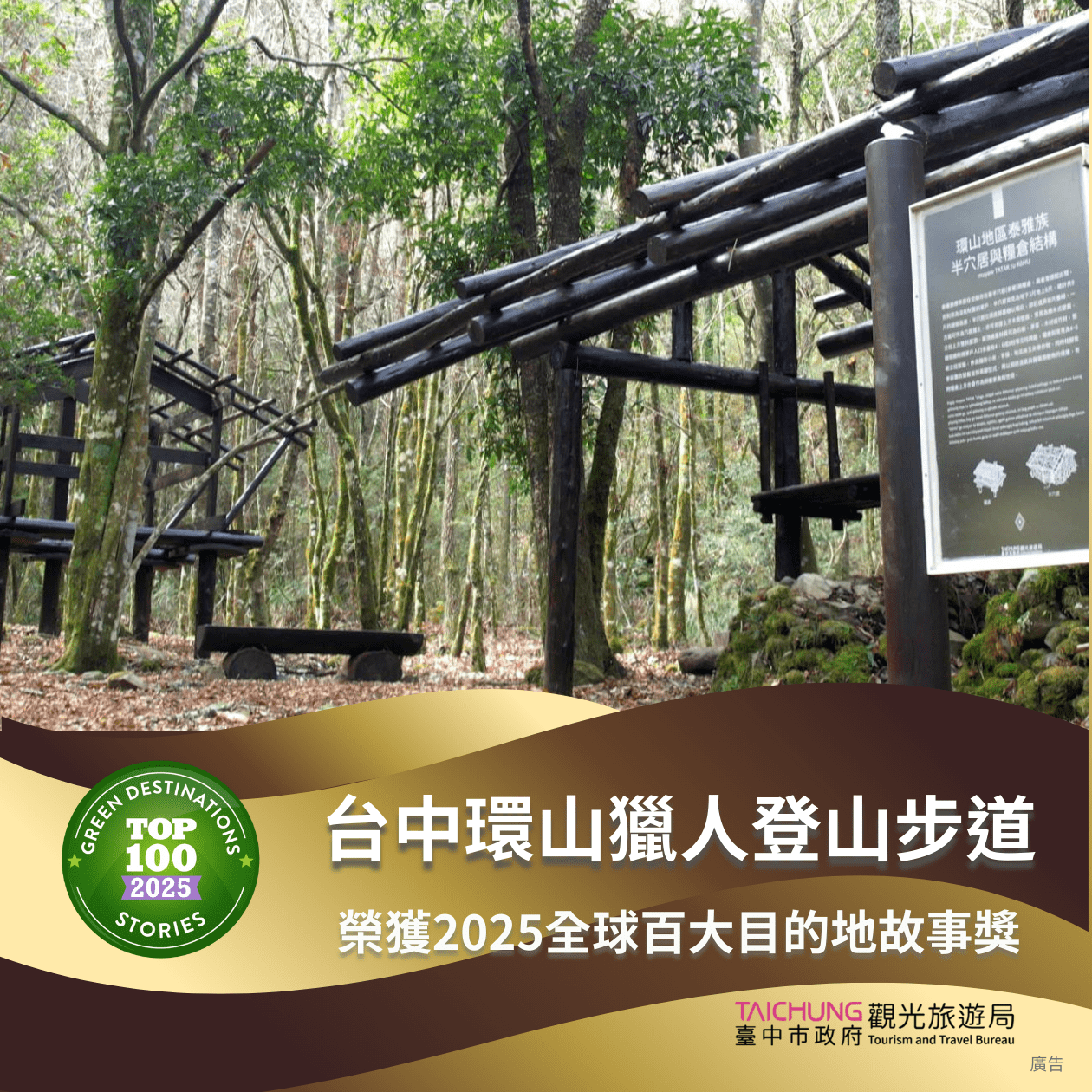 綠色旅遊目的地基金會(Green Destinations Foundation, GD)於9月28日至30日在法國奧克西塔尼舉辦「2025全球綠色目的地年會」,並頒發「2025全球百大目的地故事獎」(Green Destinations Top 100 Stories)。台中市政府觀光旅遊局以「環山獵人登山步道:重返獵人古徑、重現泰雅文化地景」脫穎而出,榮登全球百大故事,成為全國第一且唯一連續兩年獲獎的地方政府。同時,台灣味噌釀造文化館也以「在地文化成為永續旅遊的力量」,榮獲首屆「2025好旅行故事競賽」(Good Travel Stories Competition)獎項,展現公私協力推動永續的成果。