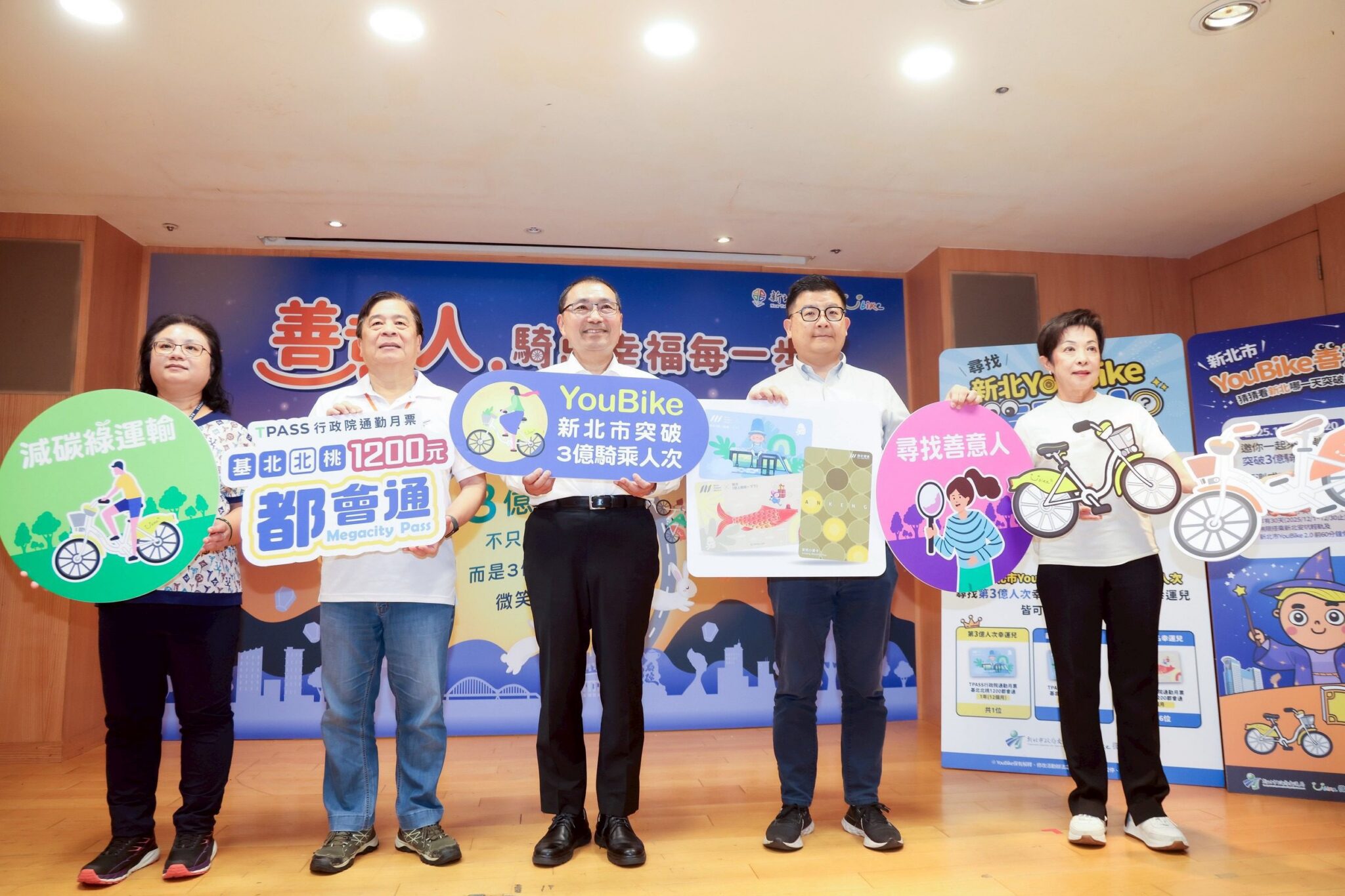 為歡慶新北YouBike騎乘人次即將突破3億,新北市政府今(30)日舉辦「#尋找善意人」記者會,推出系列活動,第3億名幸運兒可獲得一年份的「基北北桃」TPASS通勤月票,前後各11名也可獲得好禮。新北市長侯友宜出席記者會時表示,新北YouBike公共自行車系統預計今(114)年10月底累積創下3億騎乘人次新紀錄,轄內YouBike站也將達成1,500站里程碑。本次活動除了感謝各界對永續環境的善意,也希望帶動更多民眾使用YouBike,打造新北成為永續健康的宜居城市。