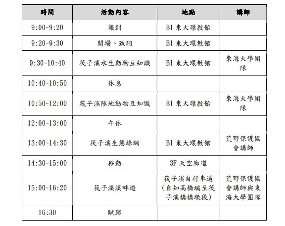 課程內容安排豐富,上午以「筏子溪生態綠網與溪畔遊」為主題,將由專業老師帶領學員認識沿線自然環境、歷史人文與整治歷程,並實地走訪自行車道,觀察溪畔景觀與生態樣貌,親身體驗守護自然的行動。下午課程則以「筏子溪動物豆知識」為重點,透過輕鬆有趣的方式介紹溪畔常見的魚類、水生昆蟲、鳥類、兩棲爬蟲及哺乳類,協助學員理解生物多樣性的價值,並培養尊重自然、友善環境的態度。