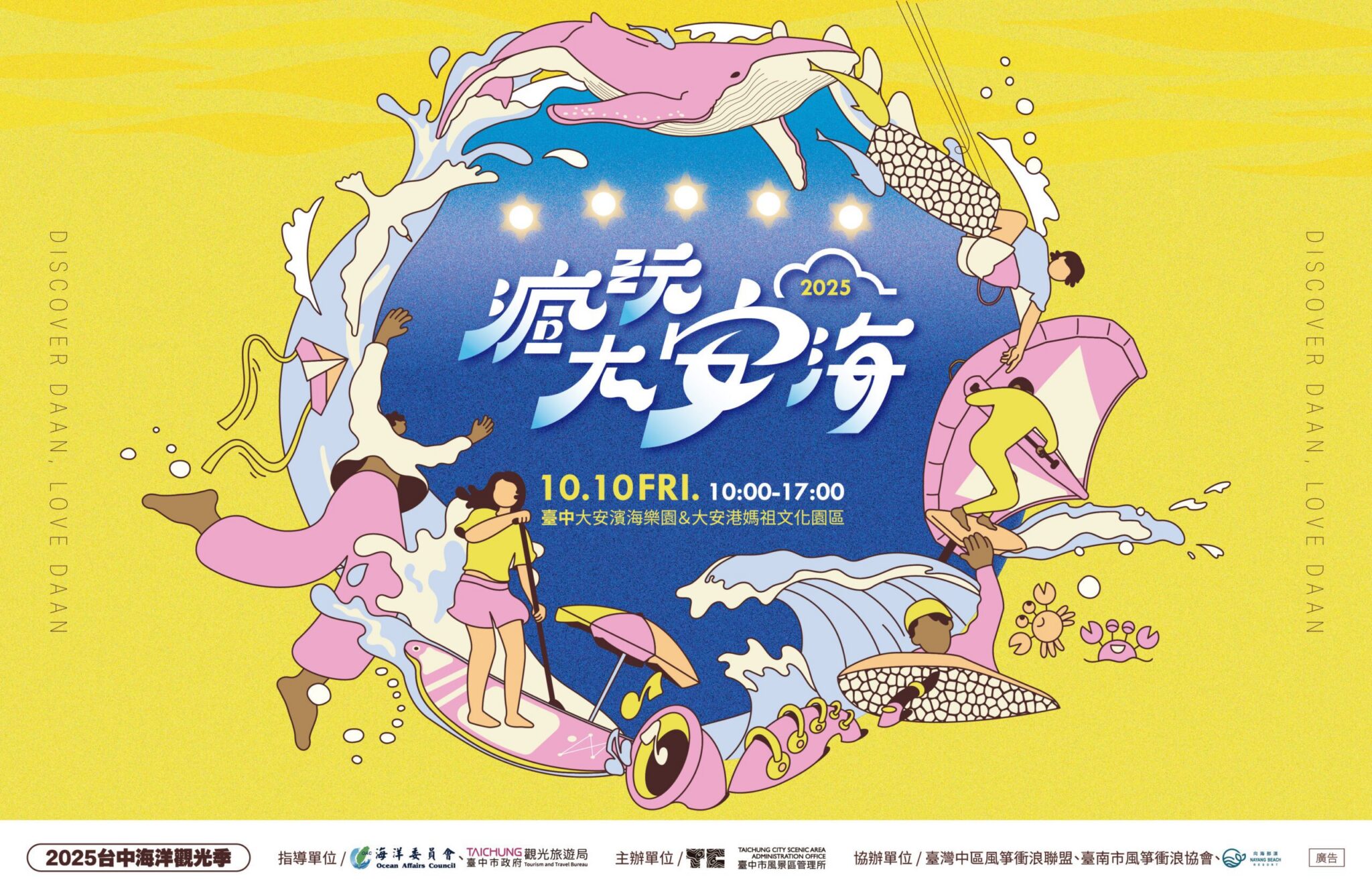 市府進一步邀請運動旅人可在10月19日參與邁入十週年的「時代騎輪節暨主題路跑」,從市府廣場出發,途經中央公園、高美濕地,最後挑戰藍色公路,以單車視角感受台中的自然風光與城市魅力。此外,超萌小騎士們,也將在府會園道展開滑步車趣味賽,營造全齡共享的運動氛圍。而喜歡海洋的民眾,也能在10月10日提前前往大安,參與「大安海觀光推廣活動」,體驗風箏衝浪與濱海市集,留下最暢快的假期回憶。