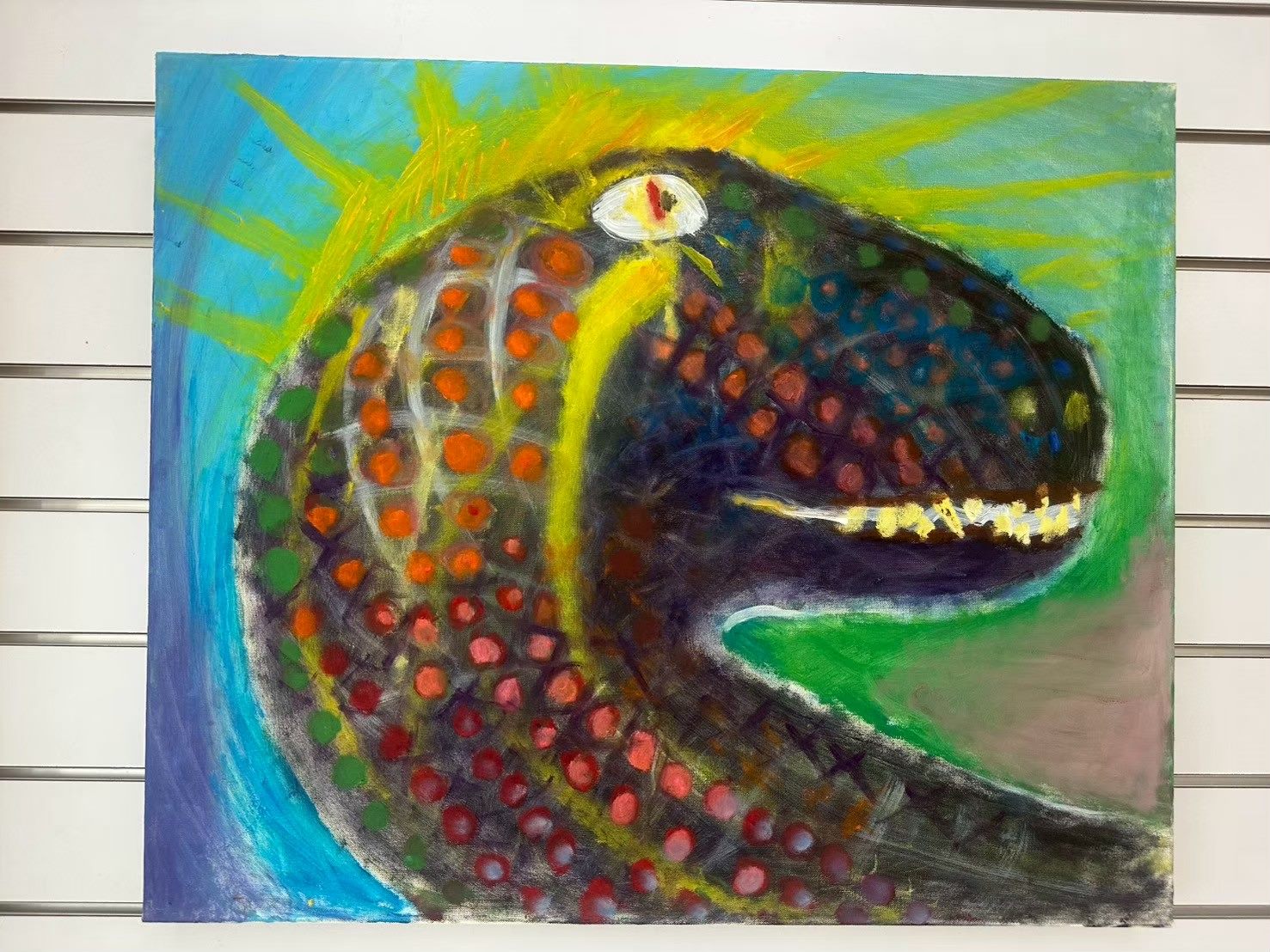 陳冠瑾的《夜之戰鬥系列》則以瓦楞紙作畫,將心中的冒險故事化為畫面,主角「惡夢之月」與滿地寶物交織成戲劇性的對決場景,強烈的色彩對比營造出童趣又野性的張力。而臺北特教學校學生凃學鈞則帶來極具巧思的《報紙狗狗》,利用新聞紙拼貼創造出可愛小狗的身影,紋理別具特色,整體畫面童趣盎然、充滿生命力,令人印象深刻,展現特殊教育學生在藝術創作上的無限可能。