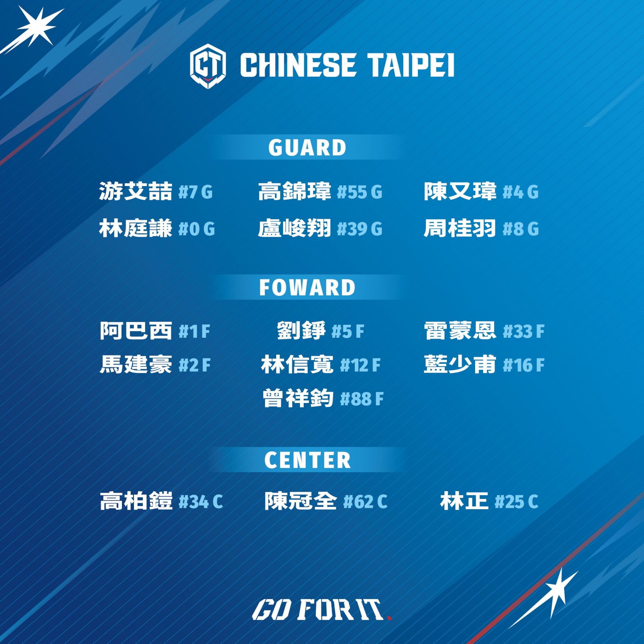 中華隊自2月10日展開集訓積極備戰亞洲盃,由總教練圖齊率軍將於20日在臺北和平籃球場迎戰強敵菲律賓,中華隊一哥、「臺灣隊長」劉錚率領旅外球員林庭謙、效力日本B聯盟的阿巴西、游艾喆、曾祥鈞參戰,另還有在前階賽事展現強大禁區牽制力、對戰紐西蘭霸氣狂煽7次阻攻的「新臺灣人」高柏鎧,將持續展現PLG聯盟最佳防守球員實力、捍衛中華隊內線;TPBL本土得分王高錦瑋、杭州亞運3X3金牌主將林信寬、新科PLG得分王盧峻翔則提供火力支援,扮演隊上新生代衝殺取分的關鍵;而首度披上中華隊戰袍、傳奇名將雷克斯之子的新秀雷蒙恩的國家隊首秀也令人備受期待。