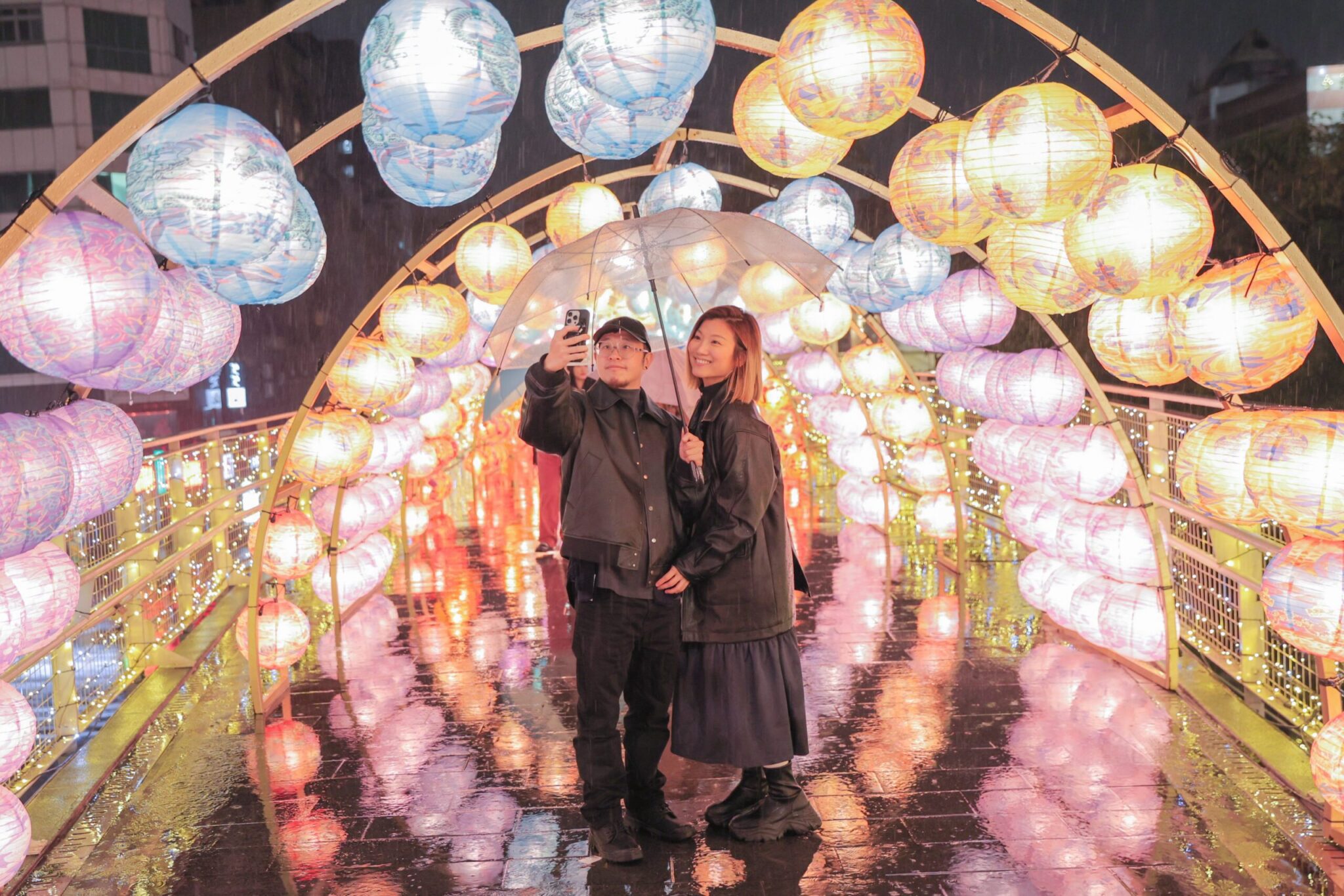 在捷運西門站6號出口的「等待豐收的樹」,是與日本搖滾天團GLAY主唱兼藝術家TERU攜手打造,冰藍色調營造出雪國般的夢幻氛圍,地面上還有雪花投影,增添唯美視覺效果,不僅適合拍照,也是述說心意的最佳場所。若沿中華路往捷運北門站方向前行,則可看到千餘顆彩繪燈籠打造的「跳躍新春」,不論晴天、雨天,白天或夜晚,都是絕佳的拍照場景,透過影片記錄心愛的他穿梭在五彩繽紛燈籠光廊中,留下難忘的賞燈回憶。
