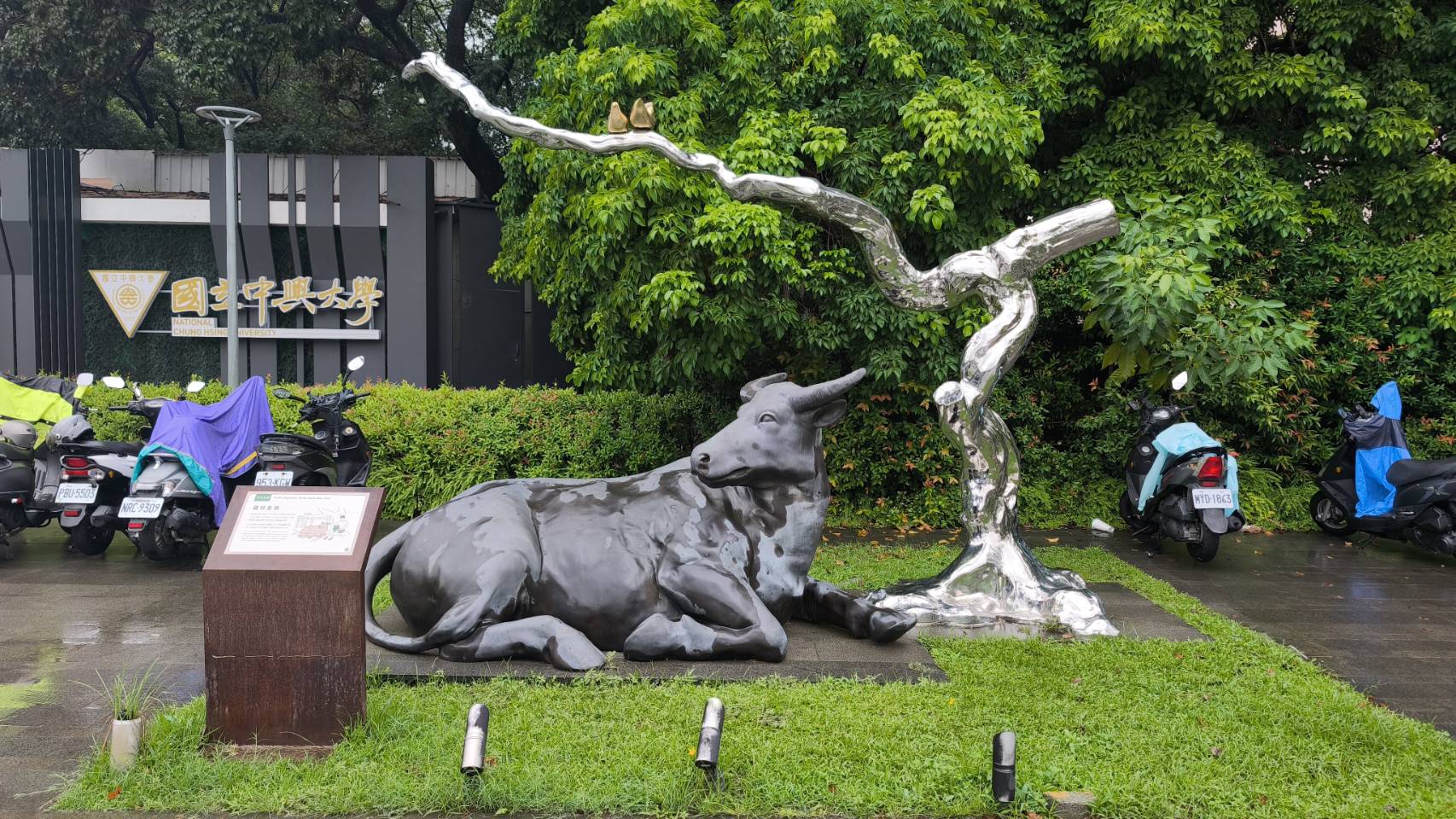 水利局分享,位於中興大學西側一門前的水牛主題裝置藝術「藏修息遊」,寓意君子勤於學習,即便休憩與遊戲也不離修習,正與綠川興大段水環境營造理念相呼應;水牛象徵勤勇與堅毅,是農耕社會的重要生產力與文化意涵,綠川興大段也如同水牛般,默默承載城市防洪安全與水環境功能,展現柔韌生命力,成為台中市民與遊客休憩、學習與感受文化底蘊的重要據點。