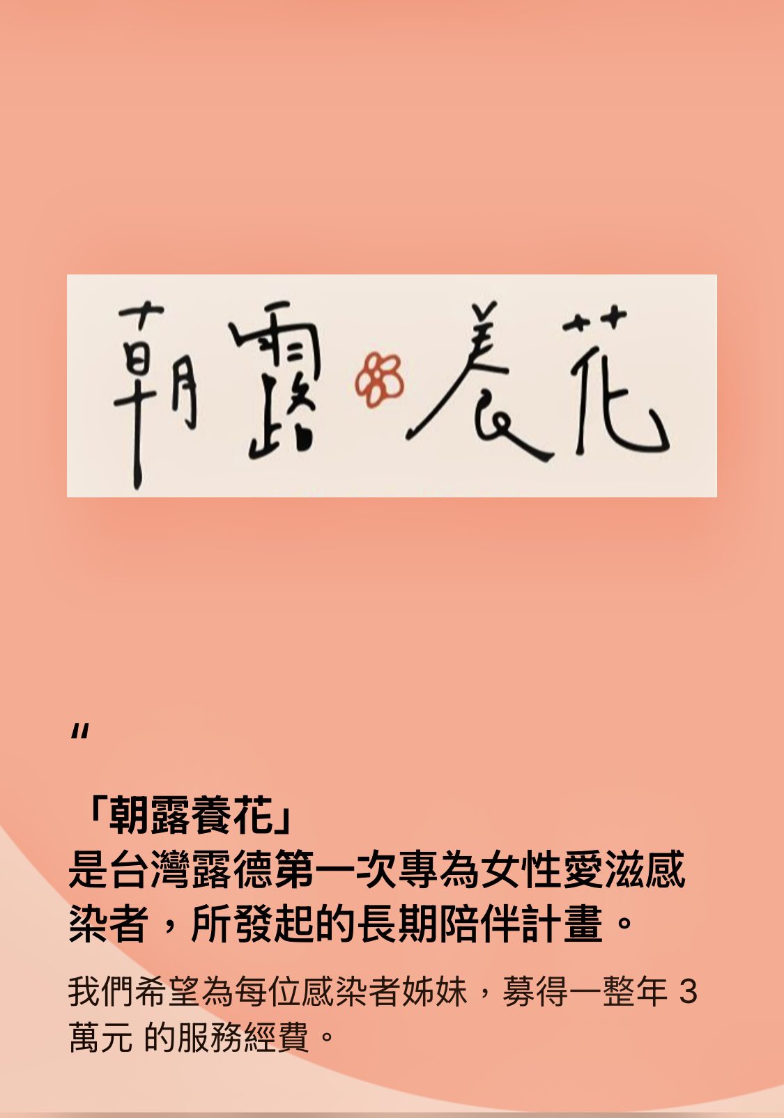 為此,露德協會啟動 「朝露養花」長期陪伴計畫──台灣第一個專為女性愛滋感染者設計的陪伴方案。計畫希望為每位感染姊妹募得每年3萬元的服務經費,透過與各地醫院合作,展開心理支持、教育講座、愛滋篩檢、支持團體與培力課程,讓女性感染者能安心生活。