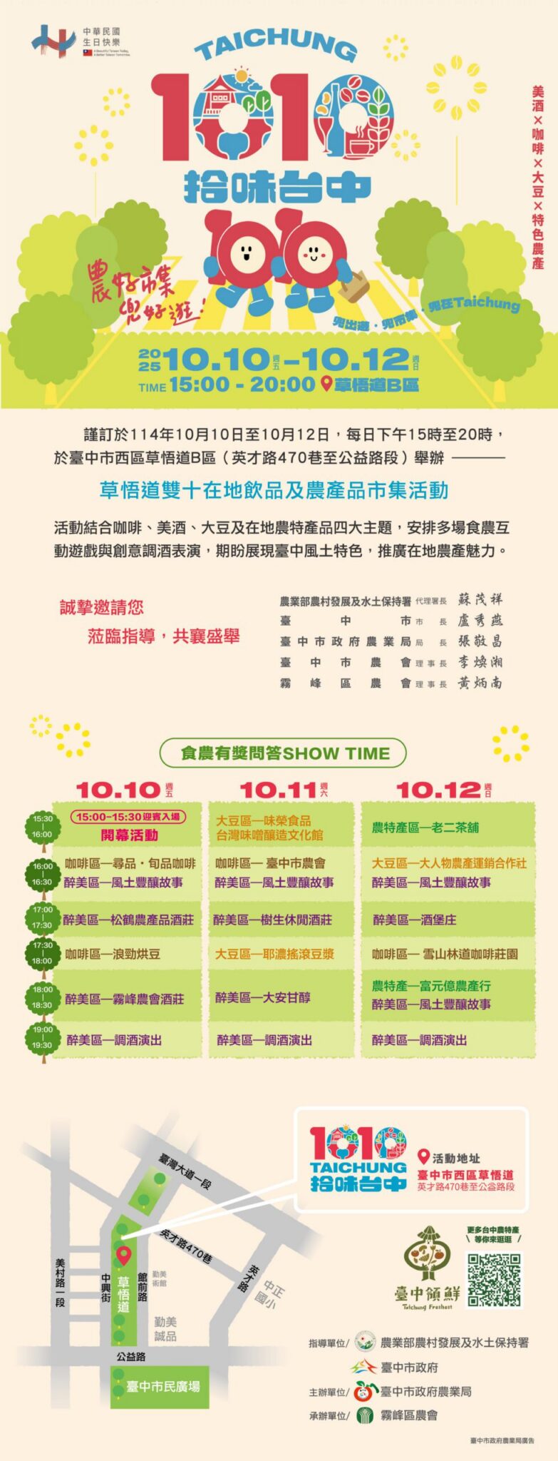 農業局表示, 雙十草悟道在地飲品及農產品市集活動以台中特色農產為核心,規劃咖啡、美酒、大豆及農特產品四大主題展區,從精品咖啡的香氣、台灣地酒的風味,到非基改大豆的食農故事與農特產品展售,完整呈現台中農業的多元樣貌,現場更安排多場食農教育互動與雙十限定調酒演出,讓民眾在逛市集的同時,也能深入認識產地文化與飲食價值。