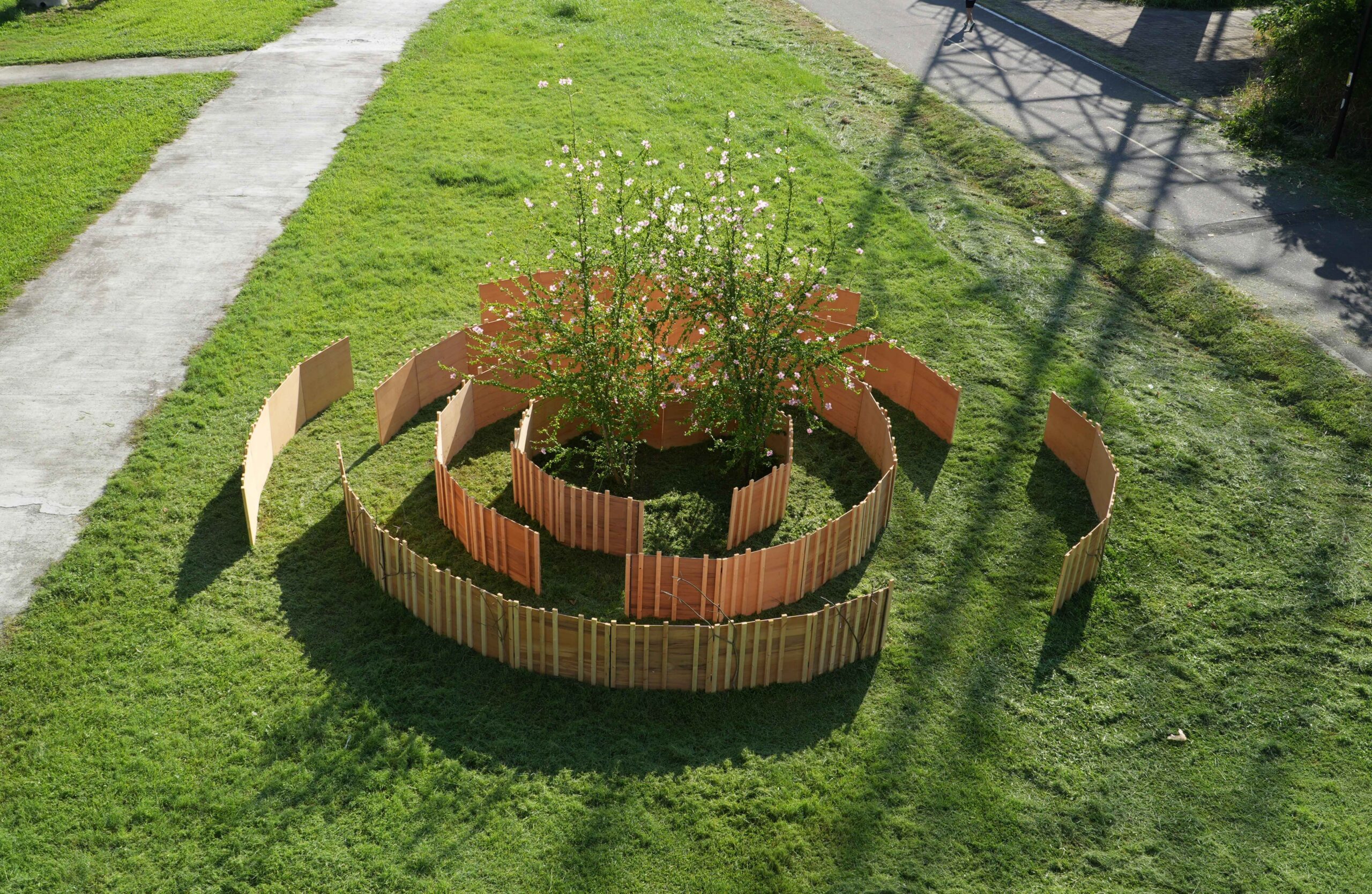 其中,李蕢至的《棲種之所》以竹編打造圓形庇護空間,如同靜待萌芽的種子,邀請觀眾走入斑駁竹影中,感受濕地的靜謐與生命力;《年輪之脈》則以松木與枝條重現年輪紋理,並透過「種子曼陀羅」共創活動,將群體願景融入作品中。