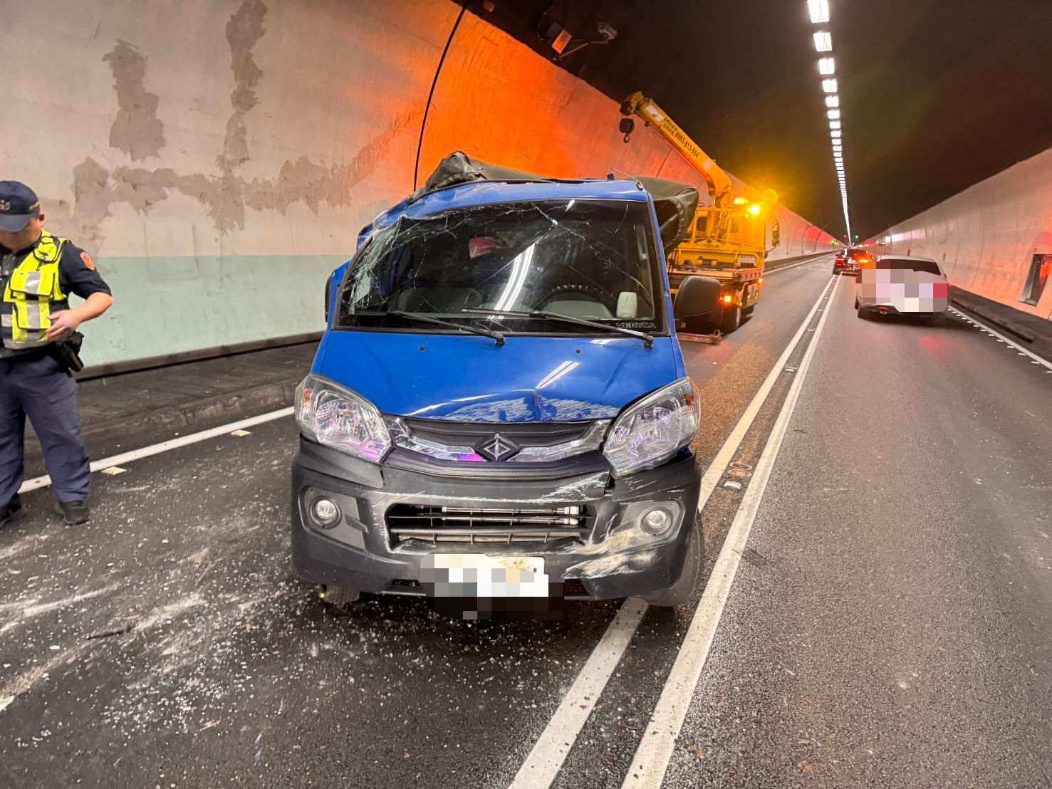 國道警察第9大隊說,陳男未受傷,酒測值為0,但同車32歲何姓女乘客的手、腳及頸部有擦挫輕傷,送往礁溪杏和醫院治療後無礙,事故約於8時25分排除,雪隧恢復雙向通車。不過事故當下因暫時封閉北上內車道,一度造成車流回堵,車速不到30公里。