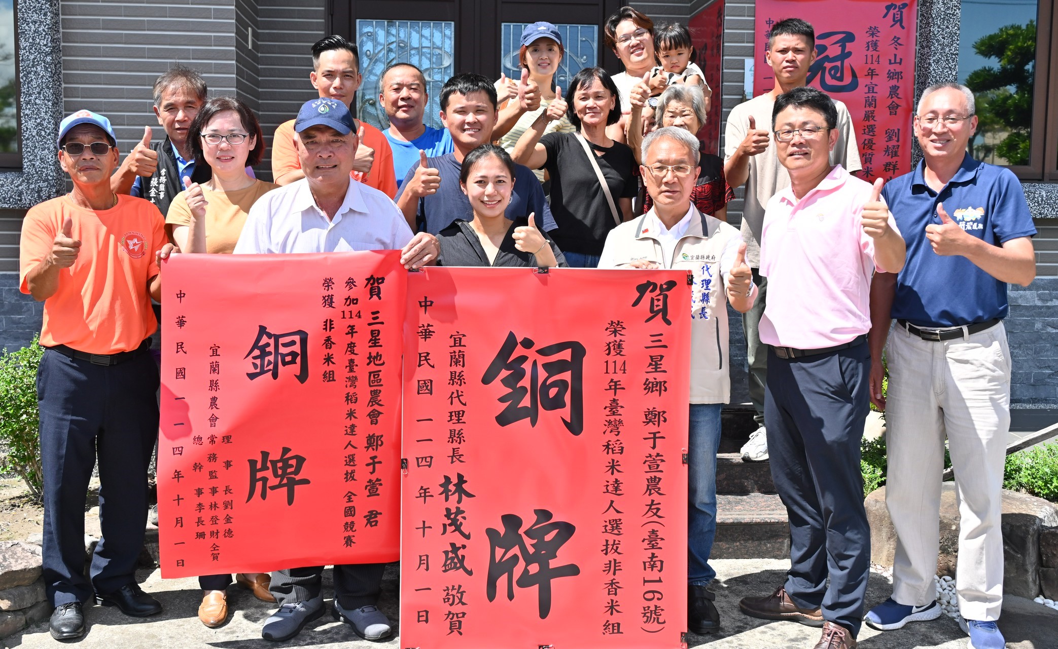 臺灣稻米達人選拔全國總決賽於10月1日登場,今年宜蘭縣共有4位農友入圍第2階段感官品評,最後分別由冬山鄉馬啟亮農友、三星鄉鄭于萱農友拿下香米組與非香米組銅牌,宜蘭市葉錫濱農友、五結鄉方福在農友分別獲得香米組與非香米組佳作,代理縣長林茂盛4日親自前往得獎農民馬啟亮、鄭于萱及葉錫濱自宅處張貼紅紙,以表祝賀。
