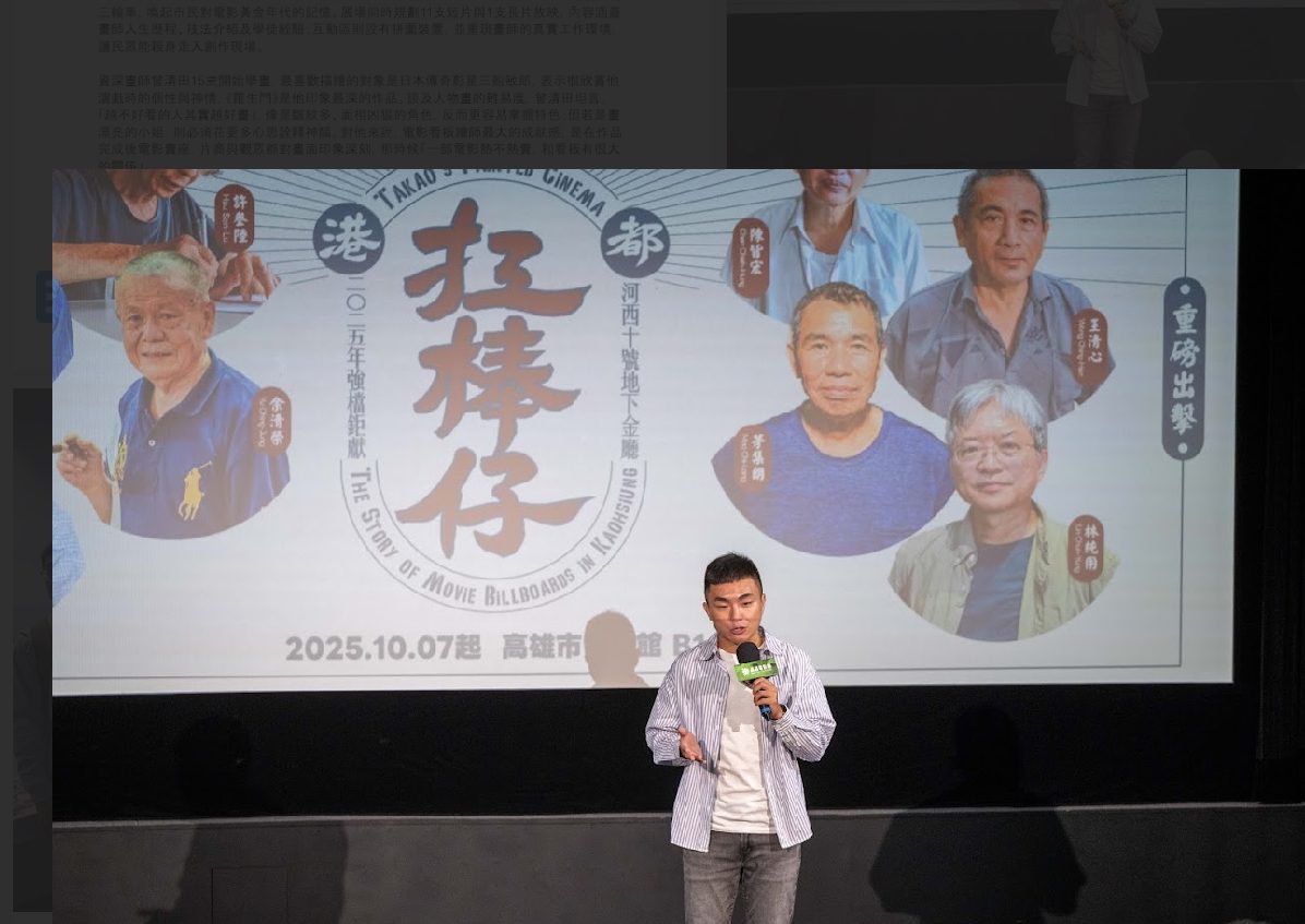 TTXC 2025高雄電影節將於10月10日(五)至10月26日(日)登場,高雄市電影館於7日率先在本館舉辦《畫雄影:港都扛棒仔》特展,以高雄戲院的手繪電影看板為核心,重現數位時代來臨之前,陪伴港都人民生活的鮮豔色彩。展覽內容涵蓋「戲院與看板」、「高雄看板畫師簡介」、「畫家工作環境」及「電影看板軼事」等單元,並特別規劃互動裝置,讓民眾重回手繪電影看板風華年代。