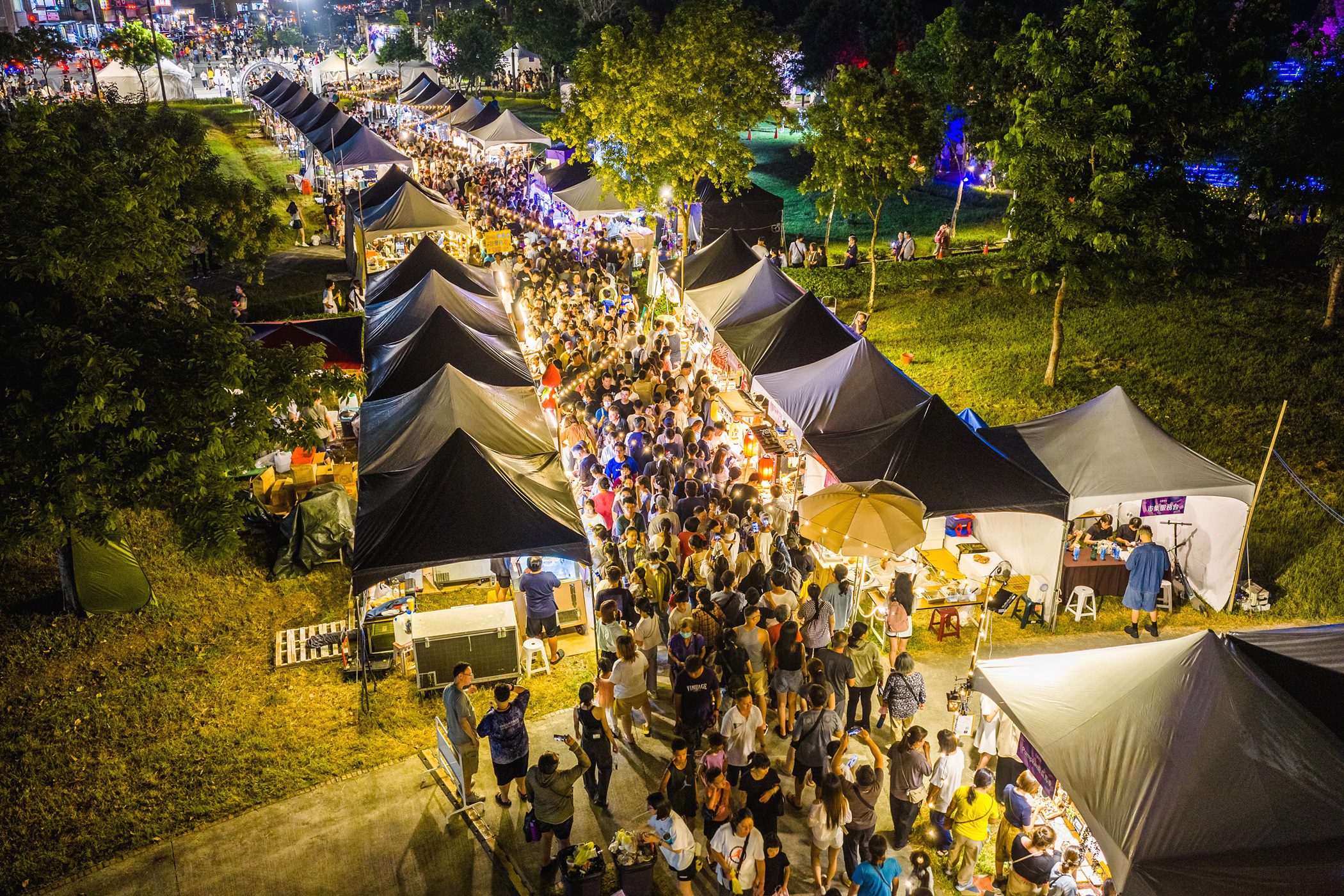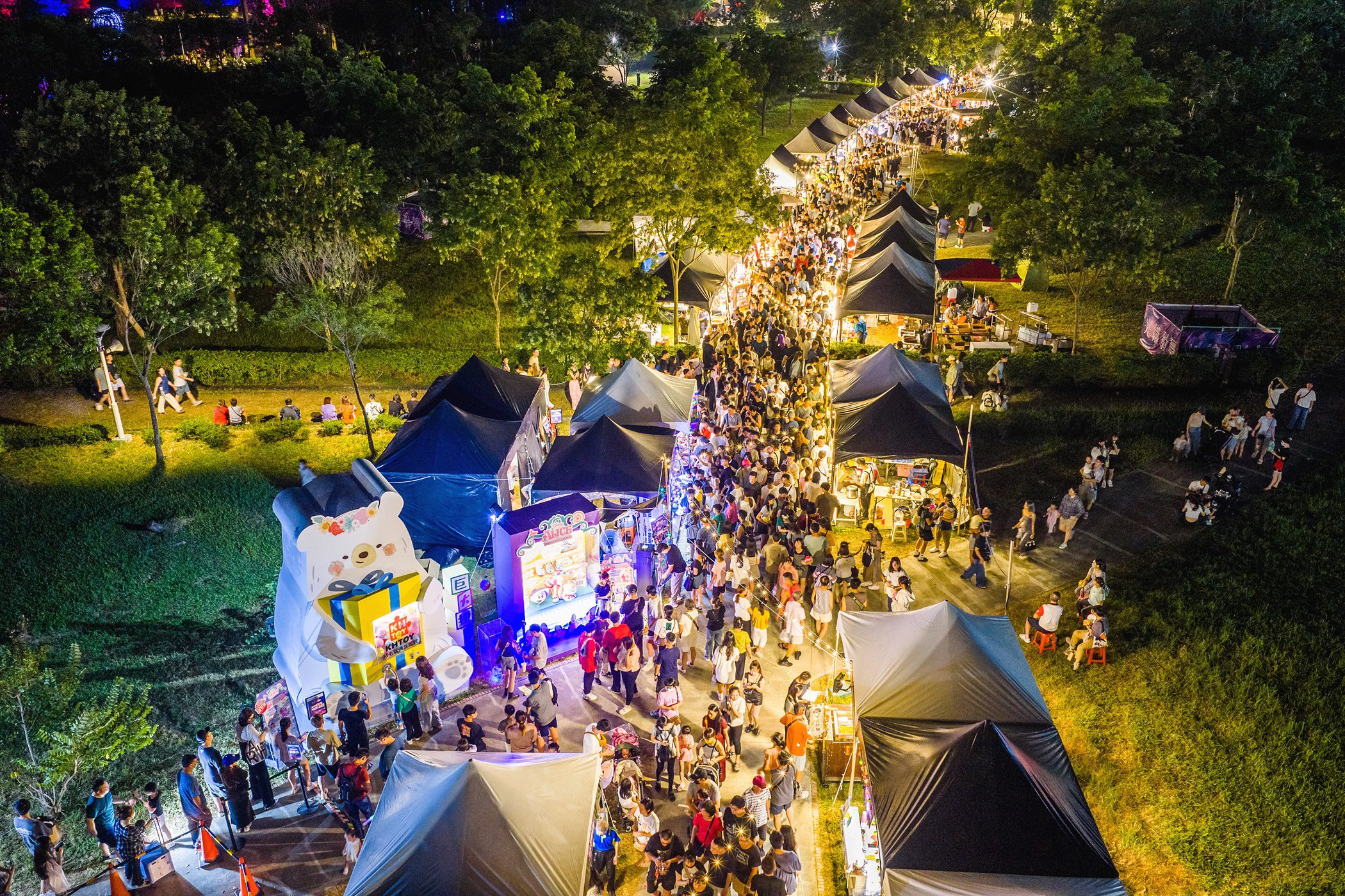 中秋三天連假期間,還有街舞冠軍團體「築夢者」、鍋爐爺爺與柏青哥等接力演出,現場熱力不斷;另還有近60攤位的「奇幻市集」同樣人潮爆滿,藝術手作、特色餐飲與發光蘑菇座椅,讓大小朋友邊逛邊拍,體驗滿滿童趣氛圍。