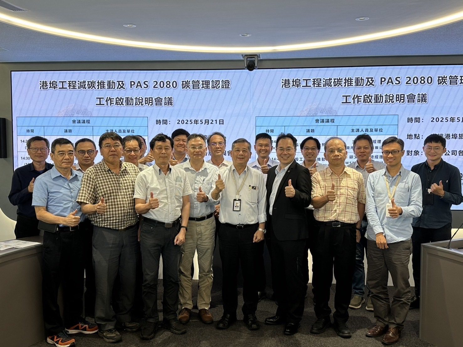 臺灣港務公司王錦榮總經理於114年5月率領總公司及各分公司工程單位同仁,並偕同專業減碳顧問,召開港埠工程減碳推動及PAS 2080碳管理認證工作啟動說明會,正式宣布本公司港埠工程減碳之重要發展目標,並指示工程單位積極配合執行,展現全面落實港埠工程減碳工作的堅定決心與組織動能。