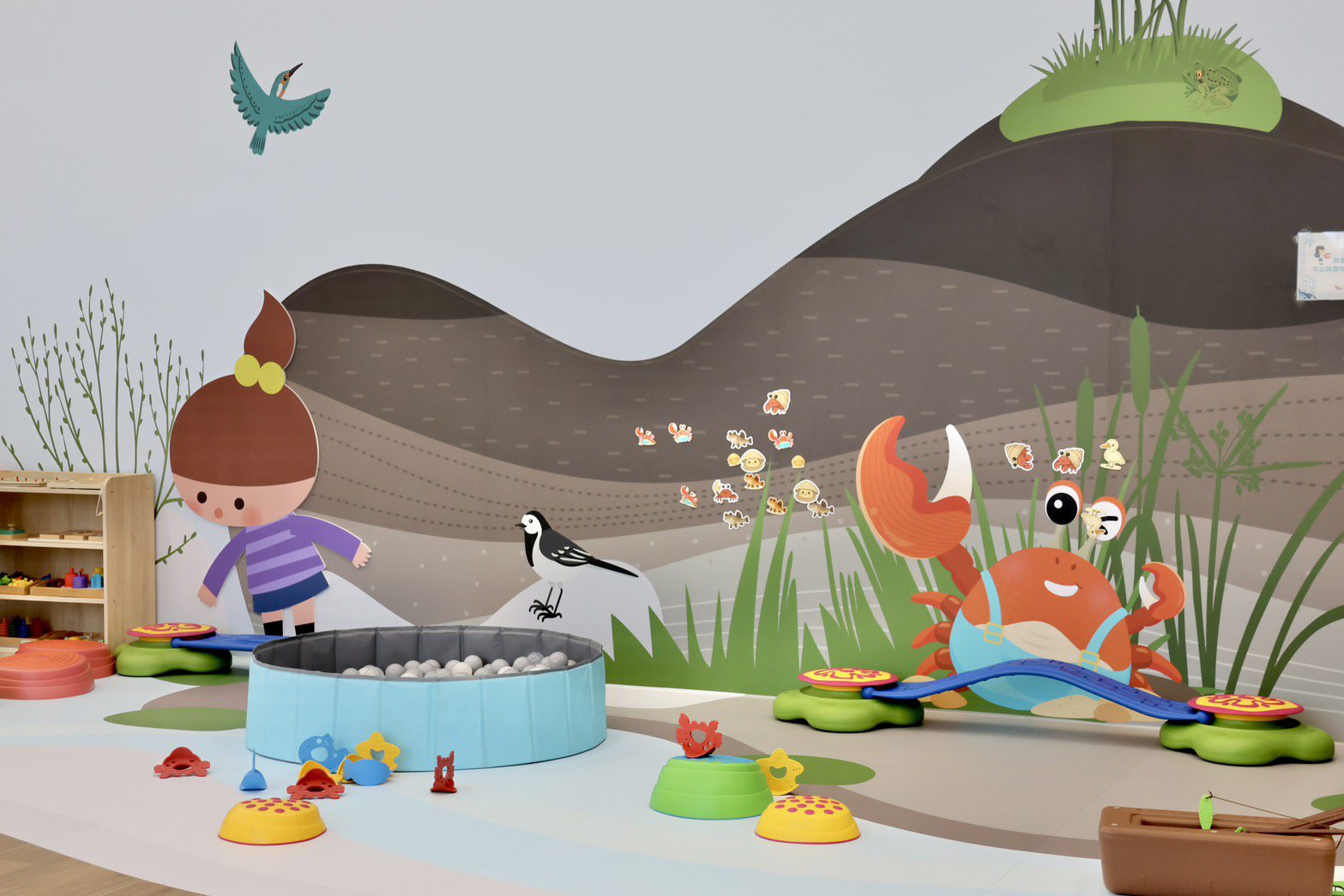 社會局指出,清水清子館結合運動元素,融入高美濕地意象,「操作區」是一面磁鐵互動牆,地面宛如海灘,讓親子想像濕地探險的樂趣;「大肢體區」設計幼兒體能人物圖像搭配大型肢體教具。「濕地探險」與「海洋環保」特色課程,帶孩子從小培養愛護自然的觀念,為海線家庭打造親子共學、共玩的新空間。