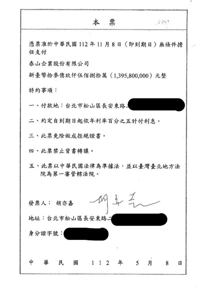「憑票准於中華民國112年11月8日無條件擔保支付泰山企業股份有限公司新台幣拾參億玖仟伍百捌拾萬元整」。這張由胡亦嘉親筆簽名、簽署日期112年5月8日的本票,交割的先決條件「必須在街口金科於收到泰山款項後6個月內取得經濟部投審司許可」,證明當時胡亦嘉收受泰山公司這筆認購老股的價款是「代收」「專款專用」性質,胡亦嘉和街口金科無權動用。