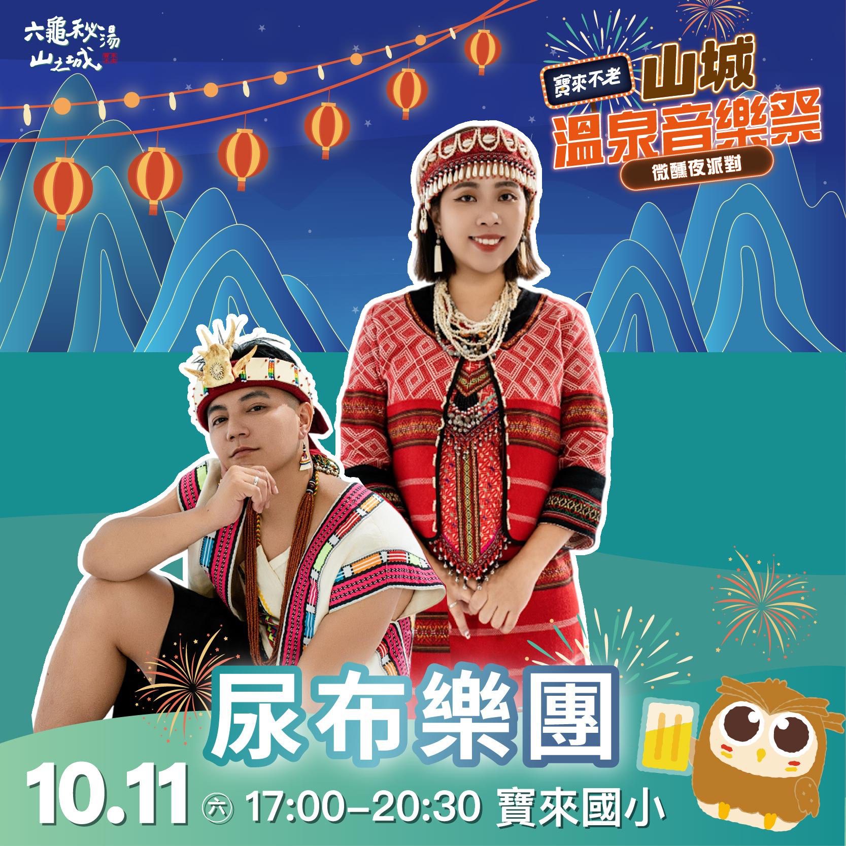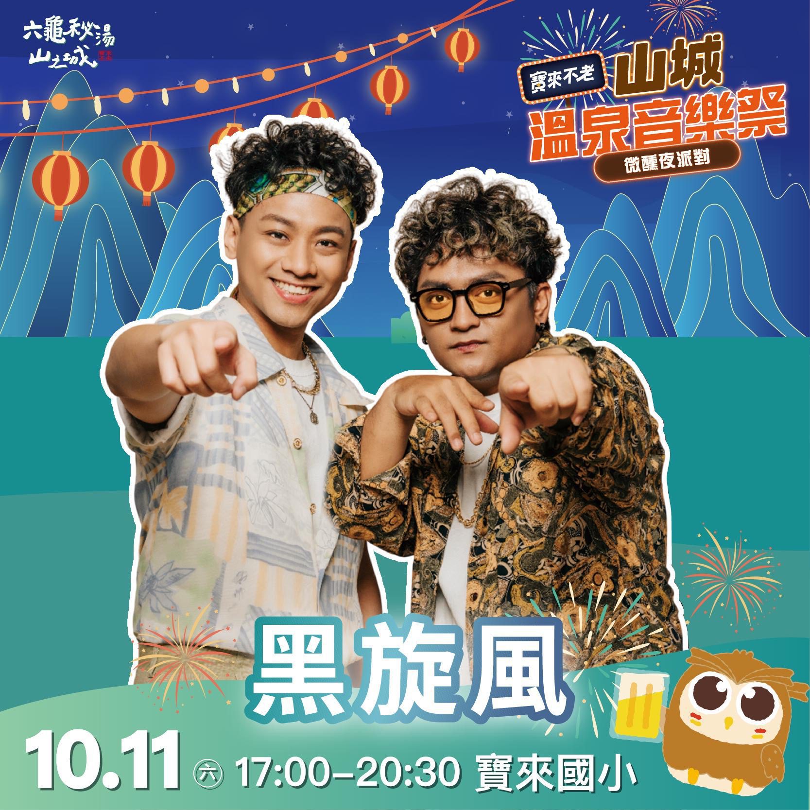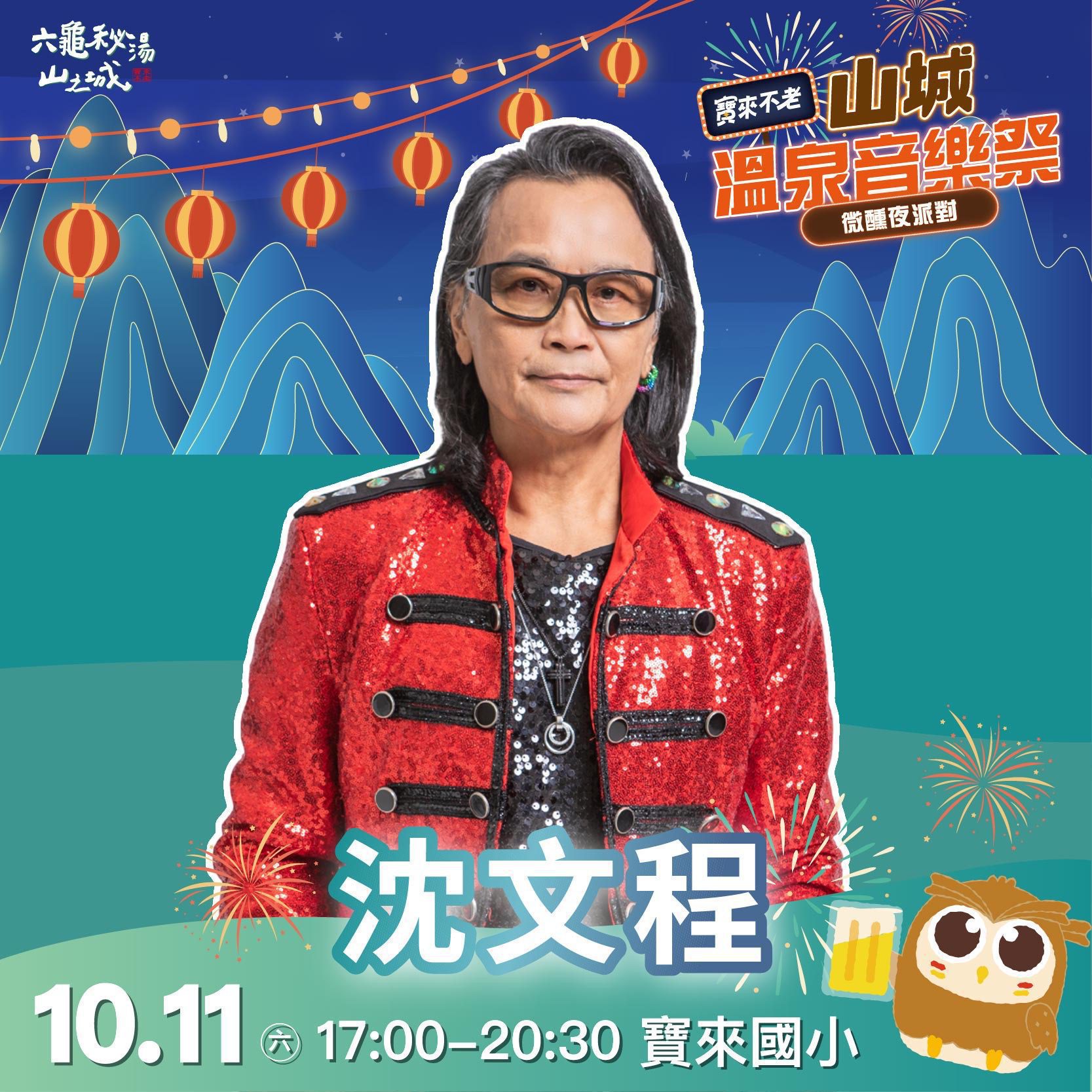 2025-2026寶來不老溫泉季以「六龜祕湯山之城」為主題,首場「山城溫泉音樂祭」將於10月11日晚間在寶來國小盛大舉辦,邀請金曲歌王沈文程、黑旋風、DJ妖嬌與尿布樂團接力開唱。