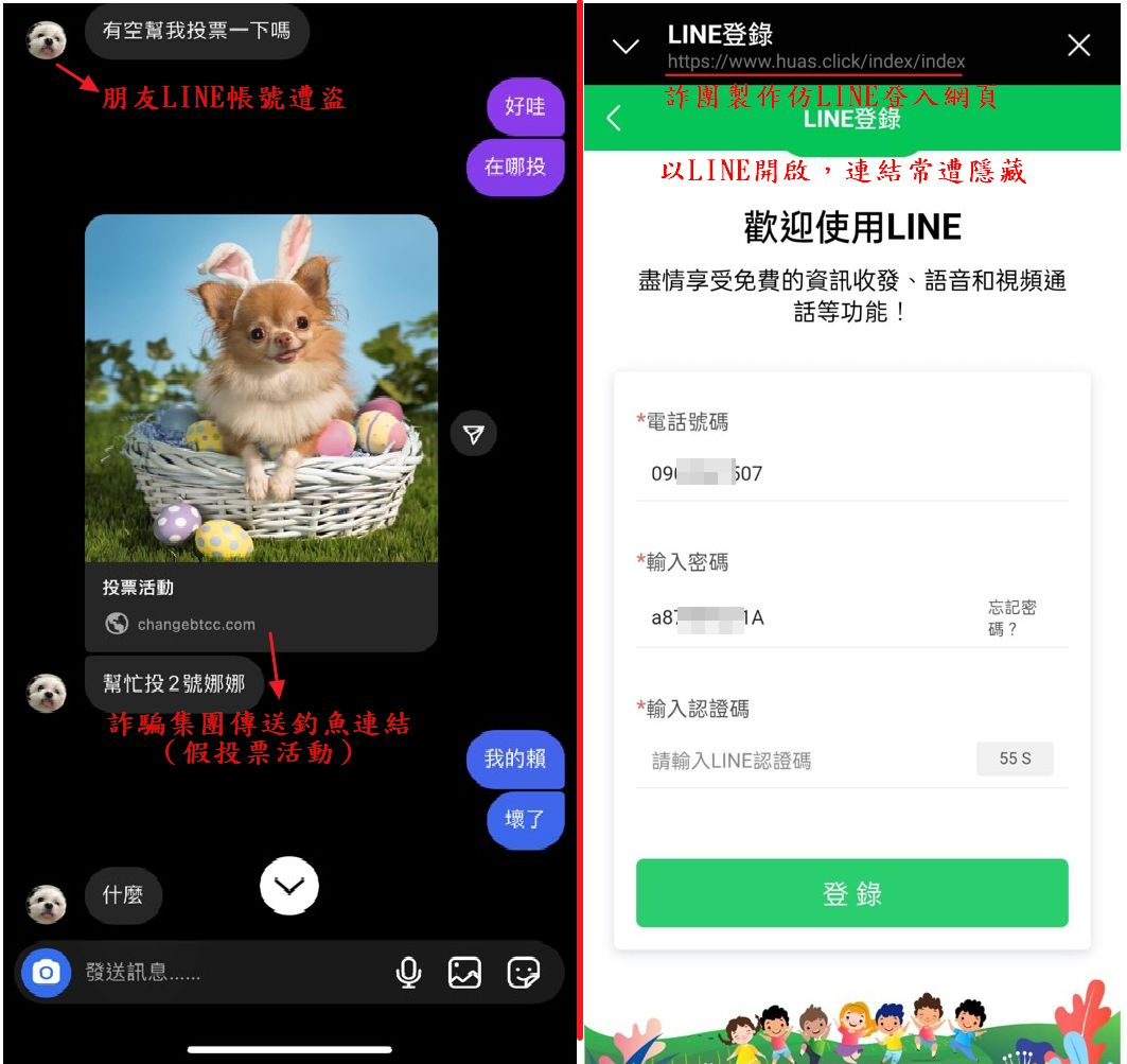 台灣民間反詐騙協會指出,近期詐騙集團頻繁以「幫我投票」、「問卷填寫」等名義,透過假網址釣魚,竊取用戶LINE帳號,利用借錢或投資等名目進一步詐騙其親友。協會以李㼈案例提醒大眾,若出現以下異常現象,極可能已被盯上或帳號已遭盜用,包括所在LINE群組突然被解散、成員名稱變成「不明」或遭退出、熟悉好友突然傳來投票或投資連結、被拉入陌生投資群,並推薦不明「老師」。協會呼籲民眾切勿隨便加入任何LINE投資群或「老師」帳號,即便是熟人邀請,也要小心謹慎,以避免落入詐騙集團陷阱。