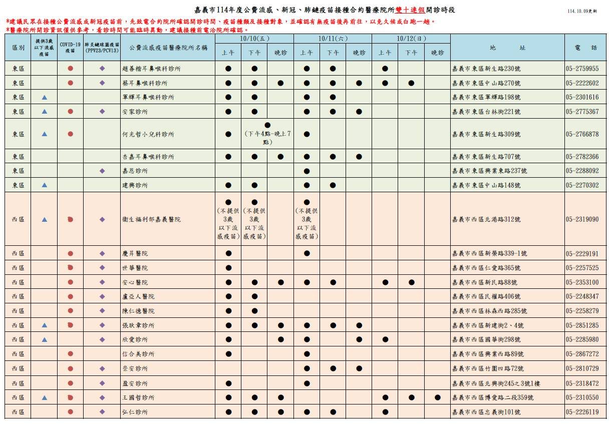 10月10日至12日適逢雙十節連假,嘉義市流感及新冠疫苗接種服務不間斷,共計65間醫療院所提供疫苗接種服務,開診資訊詳如附圖,籲請民眾前往接種前先致電醫療院所確認開診時間、疫苗種類及接種對象。