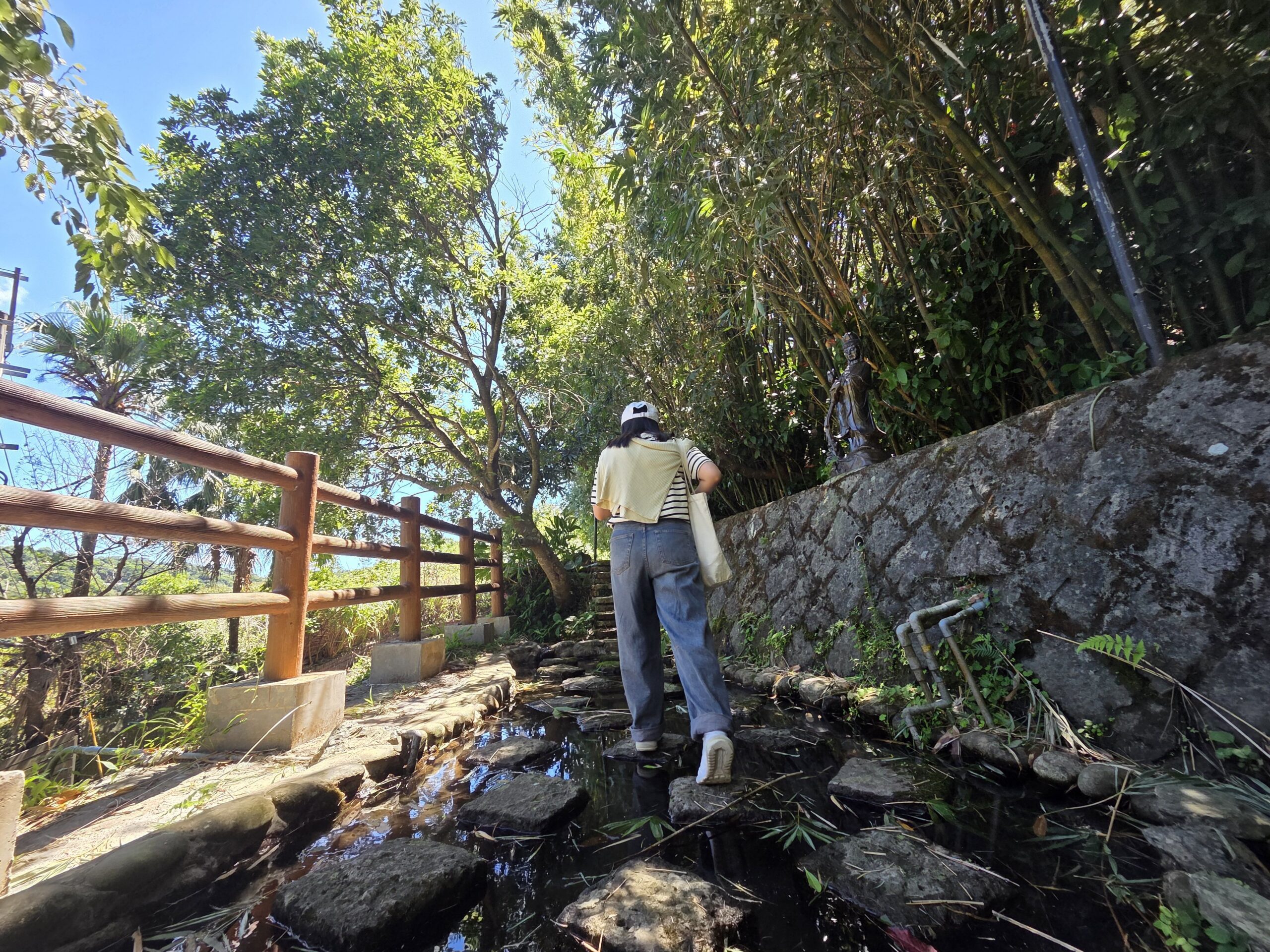 大地處說,首先來到溪山社區,進入水圳步道前,第一站是「洗腳池與洗衣池」,完整保留古早的農務生活痕跡,用最純樸的農村風貌,替旅程揭開序幕。沿著小徑前行,就是第二站最具社區代表性的「溪山百年古圳」,早期為灌溉梯田而修築,如今修復成水圳步道,沿途有潺潺流水與翠綠山林相伴,往右走可以見到一顆顆趣味盎然的「跨溪跳石」,在溪澗中忽左忽右踩著石頭過溪,就是第三站!