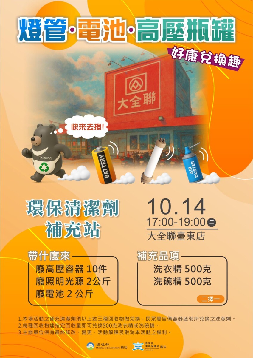 為鼓勵民眾落實正確的資源回收步驟,今(114)年下半年臺東縣環保局再次與「大全聯臺東店」攜手合作,訂於14日(二)下午5點至晚上7點在大全聯1樓賣場入口處(中興路三段592號),辦理年度最終場「自備容器 環保清潔劑補充站」活動,歡迎民眾攜帶指定回收品項至環保清潔劑補充站,凡攜帶高壓容器達10件、廢電池達2公斤(不包含鉛蓄電池)或廢照明達2公斤,即可在活動現場用自己的容器選擇補充環保洗衣精或環保洗碗精500g,每人當天最多可以補充至2,000g,歡迎縣民踴躍參與,數量有限,換完為止。